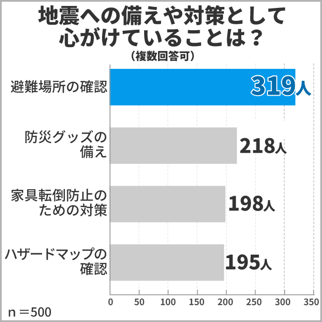 最後に「地震への備えや対策として心がけていること」を男女500人に複数回答で聞いてみた結果、「避難場所の確認」「防災グッズの備え」「家具転倒防止の為の対策」が上位となりました。