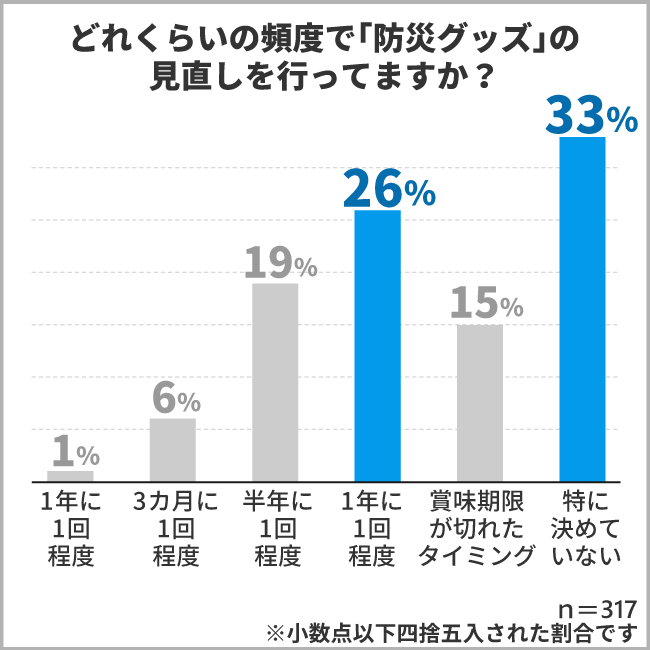 続いて、防災グッズを備えていると回答した317人に防災グッズの見直しの頻度を聞いてみたところ、「特に決めていない」が33%、「1年に1回程度」が26%、「半年に1回程度」が19%と続いています。