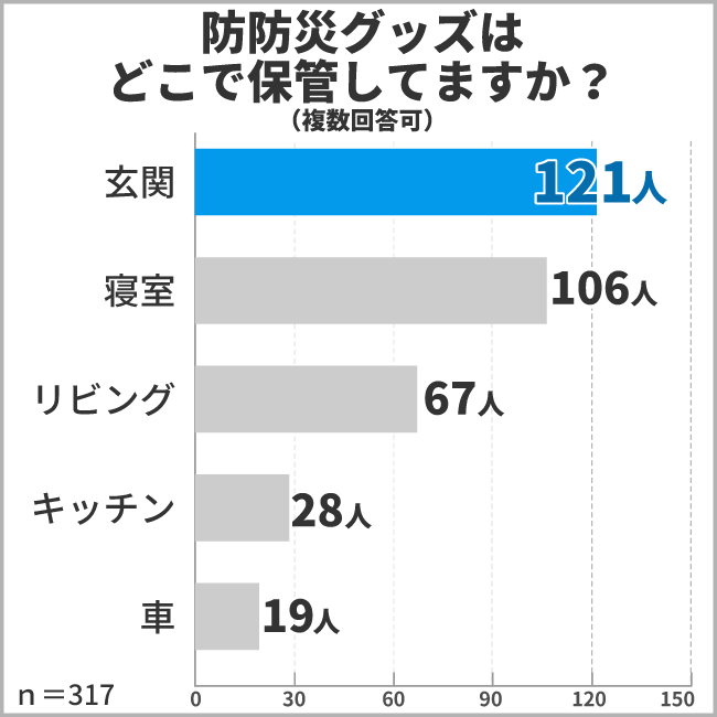 防災グッズを備えていると回答した317人に防災グッズの保管場所を聞いてみたところ、上位が「玄関」121人、「寝室」106人、「リビング」67人の結果となりました。