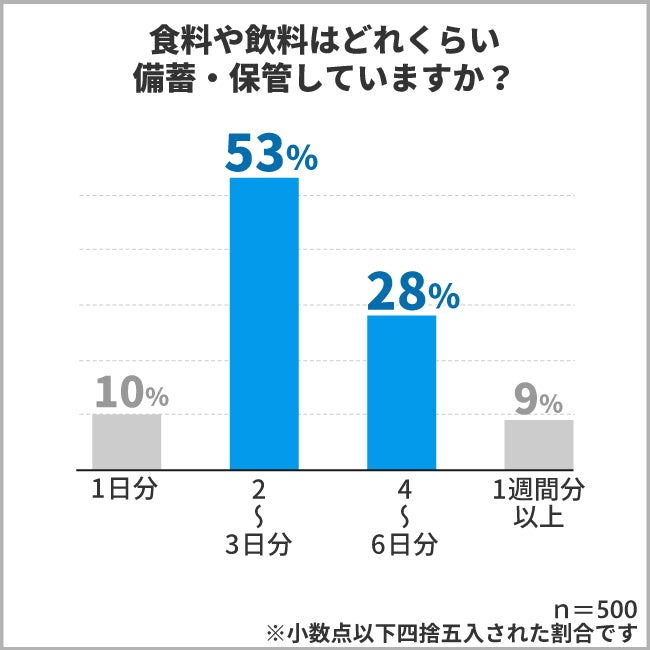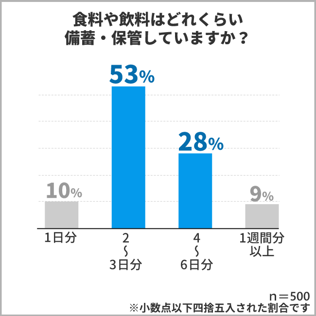 食料や飲料はどれくらい備蓄、保管しているかを500人に聞いてみたところ、「2~3日分」が53%と最も多い結果となりました。