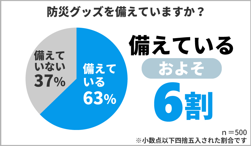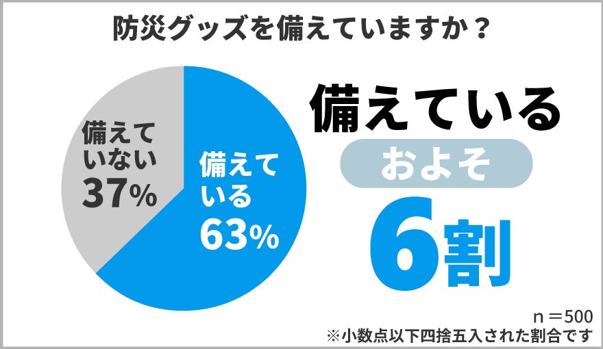 続いて男女500人に防災グッズを備えているか聞いてみたところ、63%の方が防災グッズを備えている結果となりました。