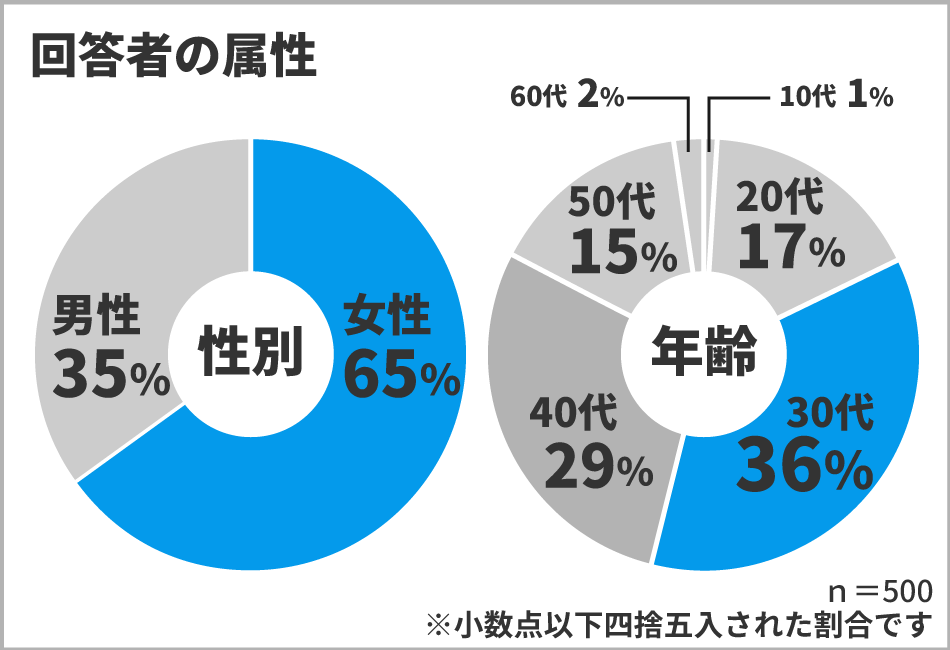 今回アンケートに答えてくださった500人の年齢や性別の割合は以下の通りです。
