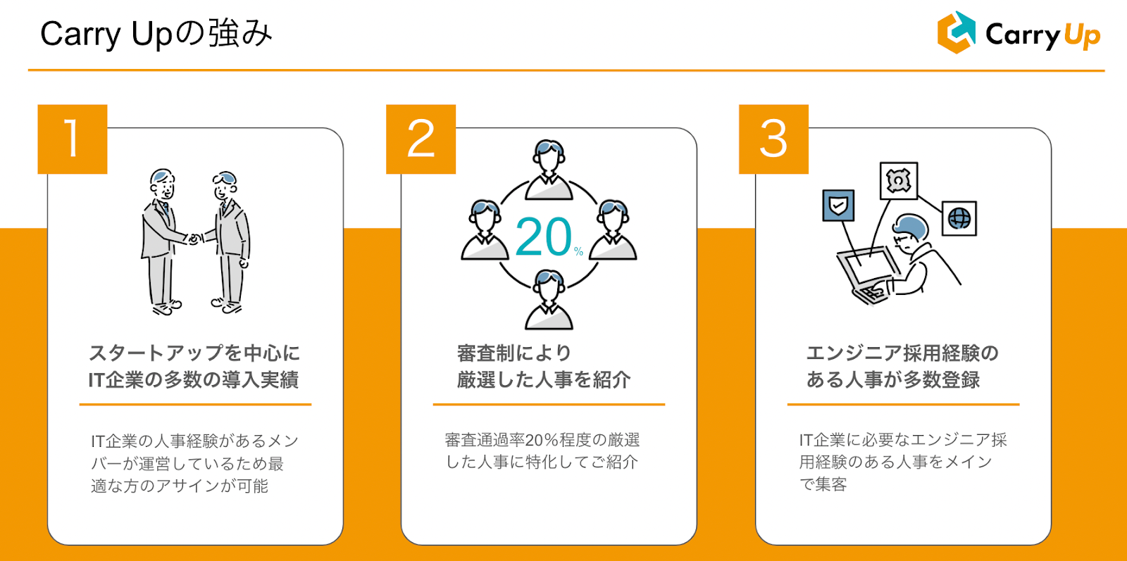 「Carry Up」とは、企業とフリーランス・複業人事の間に入り、マッチングをサポートするサービスです。IT企業の領域に特化しており、即戦力かつミスマッチの少ない人材を提案することができます。