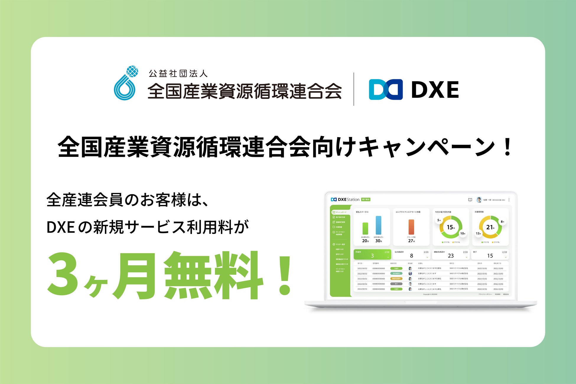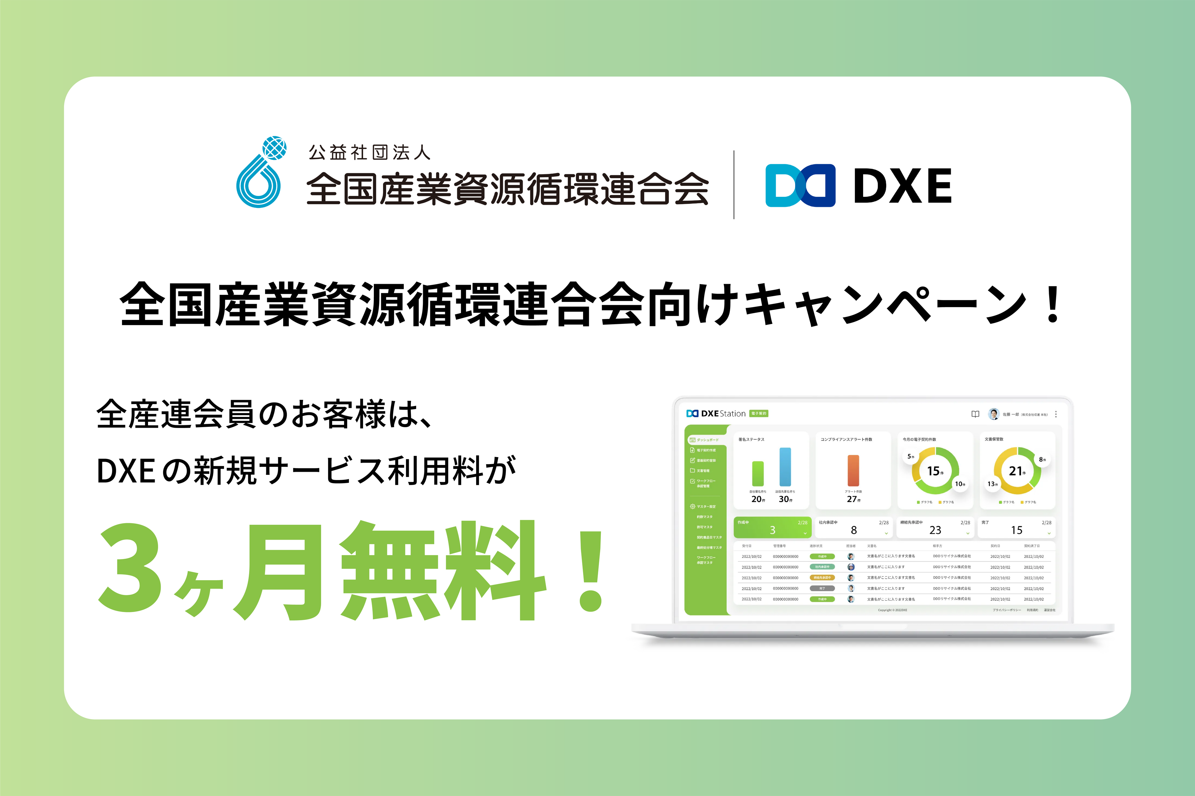 DXEでは、全産連標準契約書様式準拠契約書の使用開始を受け、「全国産業資源循環連合会向けキャンペーン」を展開いたします。全産連会員(※2)のお客様はDXEの新規サービス利用料が3ヶ月無料(利用開始月を含む)となります。