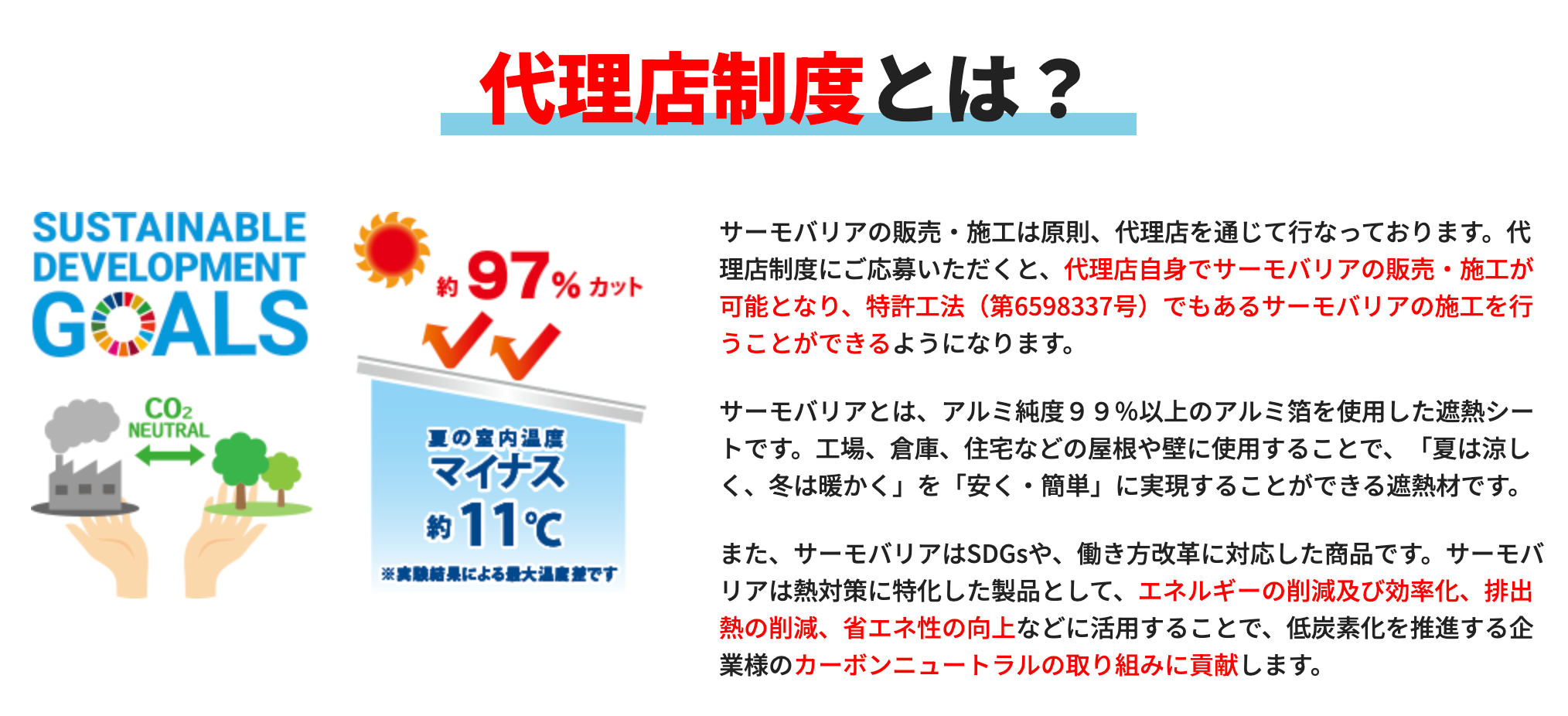 株式会社ライフテックでは、サーモバリアの販売・施工は原則、代理店を通じて行なっております。代理店制度にご応募いただくと、代理店自身でサーモバリアの販売・施工が可能となり、特許工法(第6598337号)でもあるサーモバリアの施工を行うことができるようになります。サーモバリアとは、アルミ純度99%以上のアルミ箔を使用した遮熱シートです。工場、倉庫、住宅などの屋根や壁に使用することで、「夏は涼しく、冬は暖かく」を「安く・簡単」に実現することができる遮熱材です。