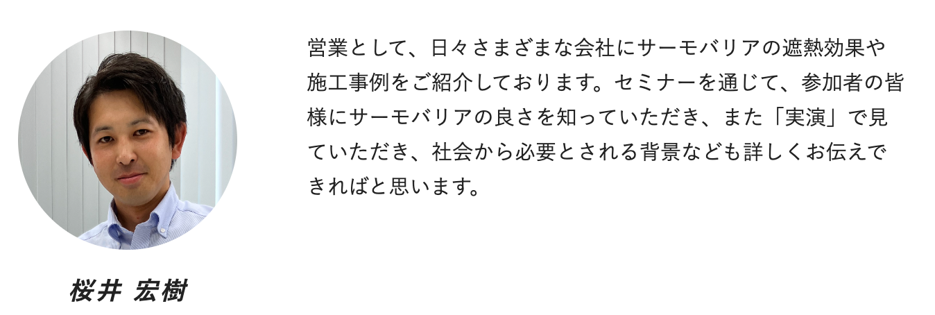 本ウェビナーでは、サーモバリアの「熱対策への効果」「代理店加盟のメリットや条件」などを30分前後でお話しさせていただきます。