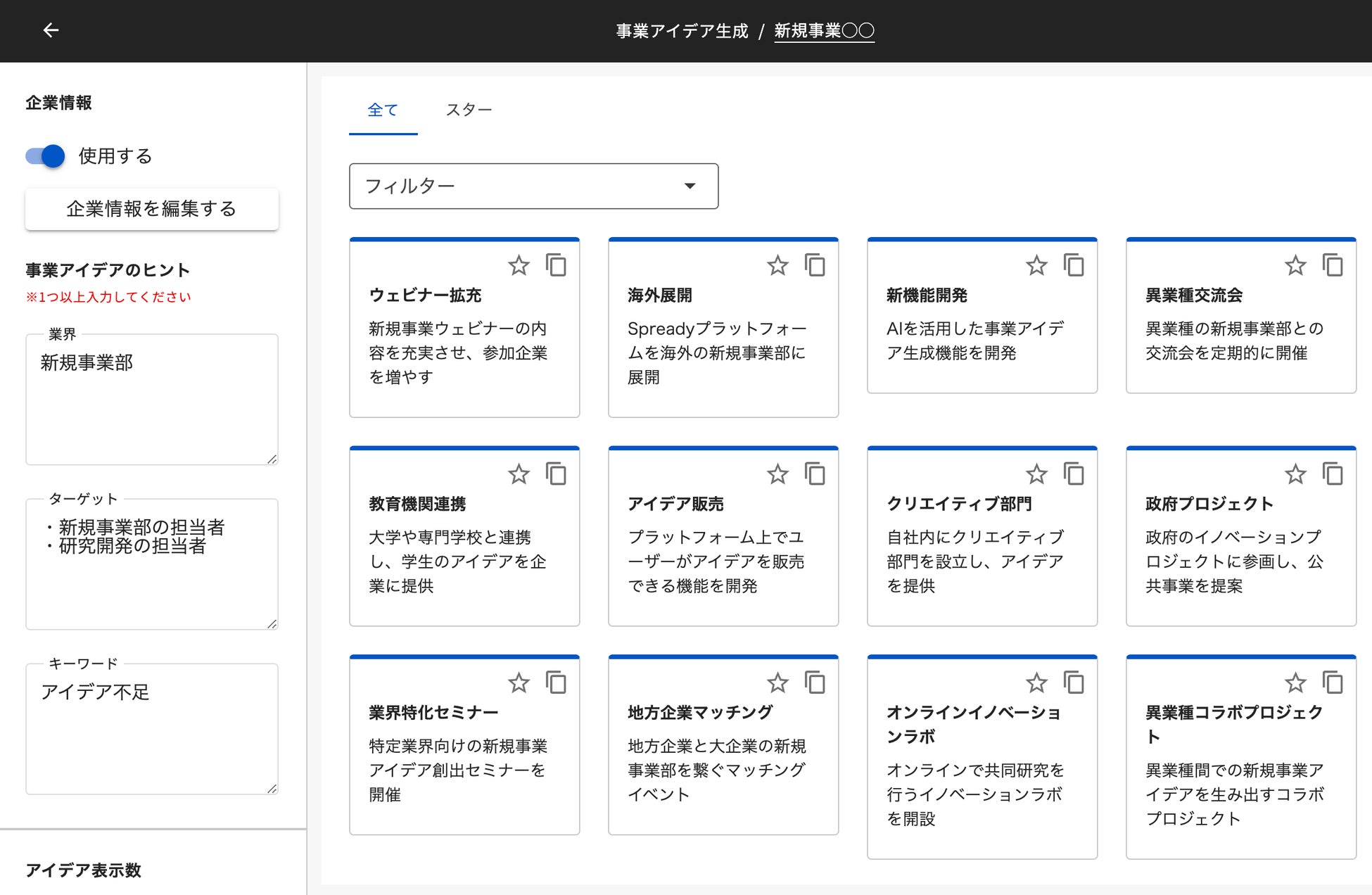 その上でアイデアを発散したい対象の業界やキーワードを入力すると、学習した自社アセットと掛け合わせたアイデアを最大100個まで発散させることが可能です。