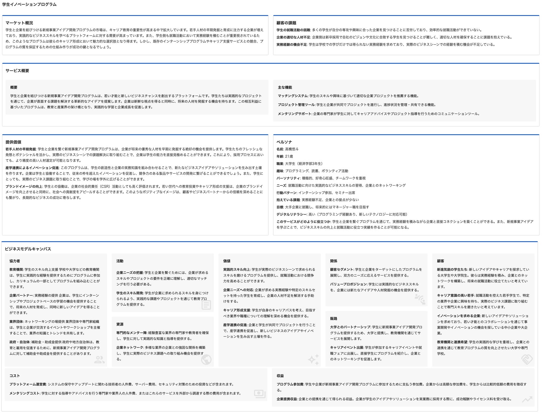 また、発散したアイデアを選定し、企画書作成ボタンを押すとビジネスモデルキャンバスが