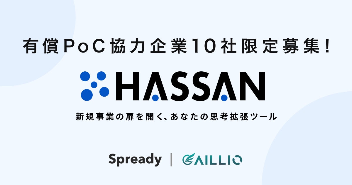 株式会社AILLIO(本社:東京都新宿区、代表取締役社長:内保徹平)とSpready株式会社(本社:東京都渋谷区、代表取締役社長:佐古雅亮)は、新規事業思考拡張ツール「HASSAN β版」の提供を開始いたしました。HASSANのAIに自社アセットを学習させ、関心のある業界やキーワードを入力すると、自社アセットと掛け合わせた新規事業アイデアの種を自動で100個まで発散できるAIツールです。この度、「HASSAN β版」の有償PoCにご協力いただける企業を10社限定で募集いたします。