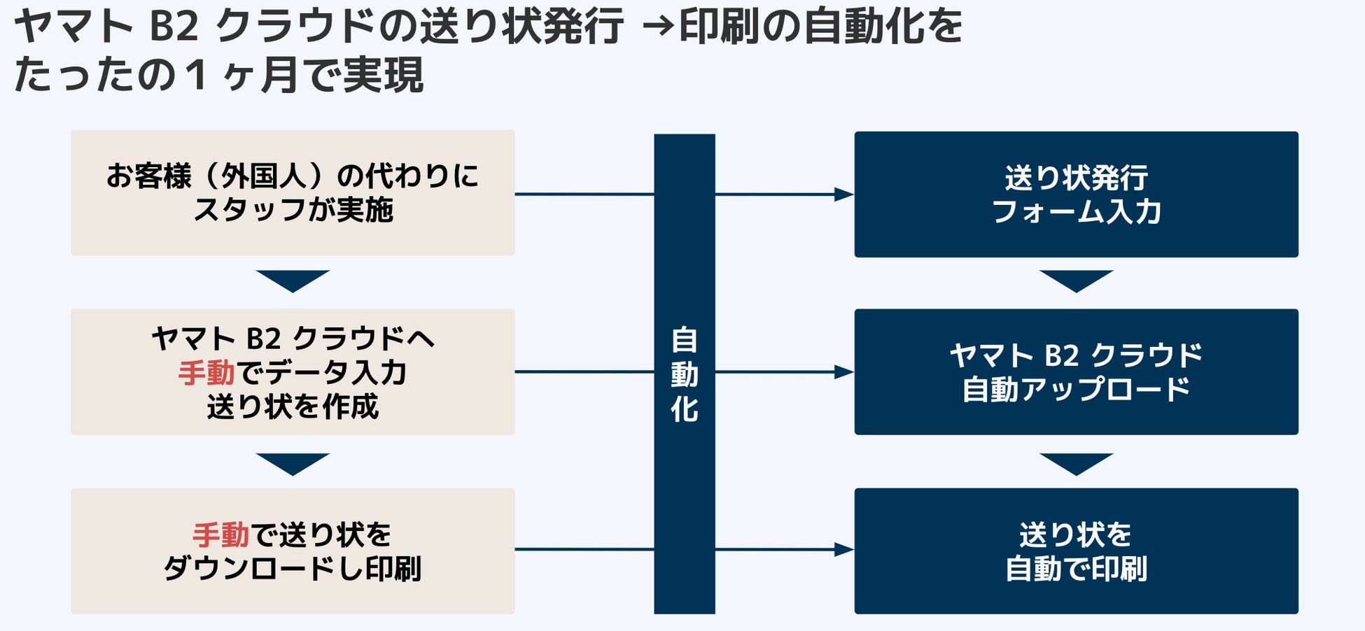 ホテルザフラッグ株式会社様にて、外国のお客様の変わりに、スタッフがヤマト B2 クラウドに手入力で情報を入れ、ヤマト宅急便の送り状を作成した後、逐一印刷するアナログ業務を、Zapier (iPaaS) とクラウドサービスを活用することで、短期間(1 ヶ月)で自動化し、スタッフの業務を大幅に削減できました。