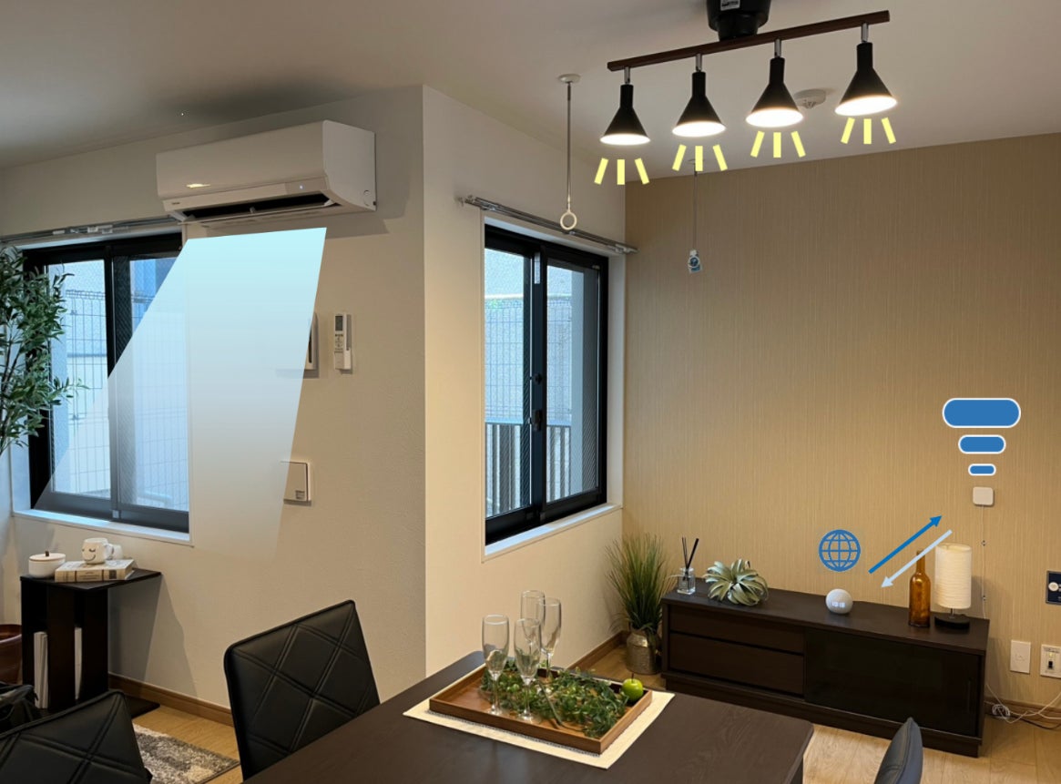 入居者様が入居する際、当社がスマート家電の初期設定およびスマートフォンへの接続設定を行い、後のアフターフォローを行います。設定作業後はお手持ちのスマートフォンでエアコンや照明のON/OFFをはじめとする室内環境の調節を、家の中ではもちろん外出先からも操作することができ、暮らしをより便利にサポートできます。また、室内ではスマートスピーカーで音声操作をすることができます。
