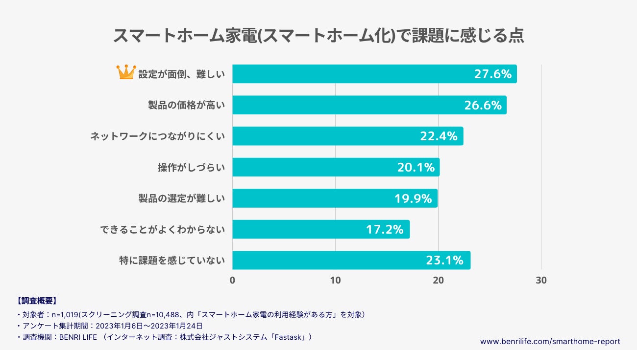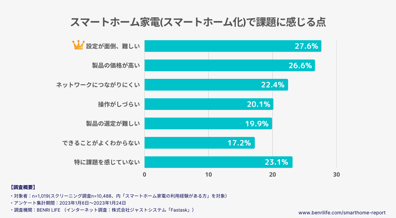 現在、10代~60代の男女10,488名を対象にした『スマートホームについての意識調査』によると、「スマートホーム家電で課題に感じる点」に関する質問で「設定が面倒、難しい」が 27.6%と 1 番多い結果となり、また多くの方が購入後の初期段階でお悩みを抱いていることが分かりました。(調査引用元:https://www.benrilife.com)