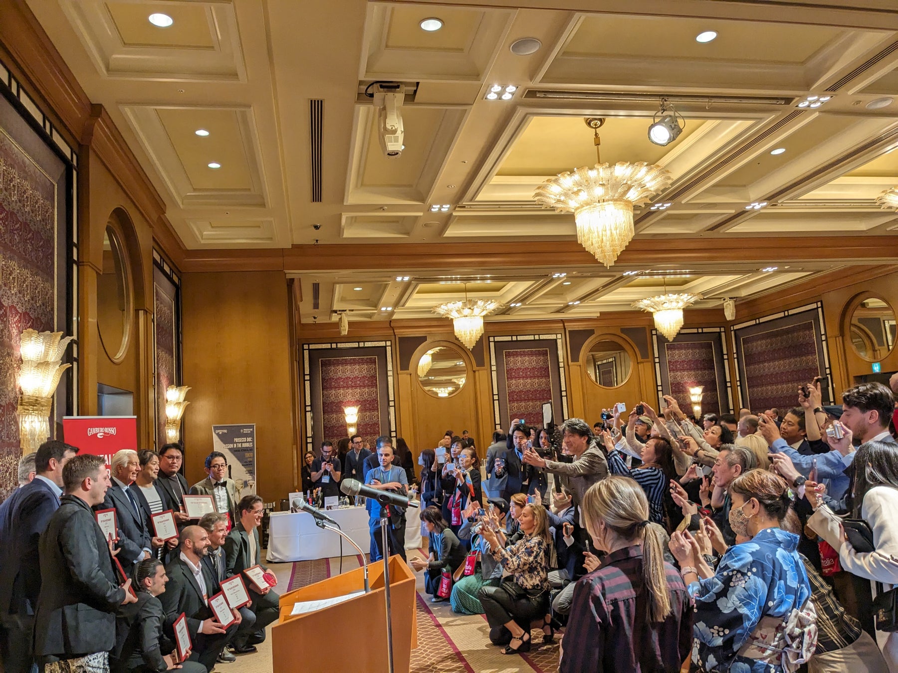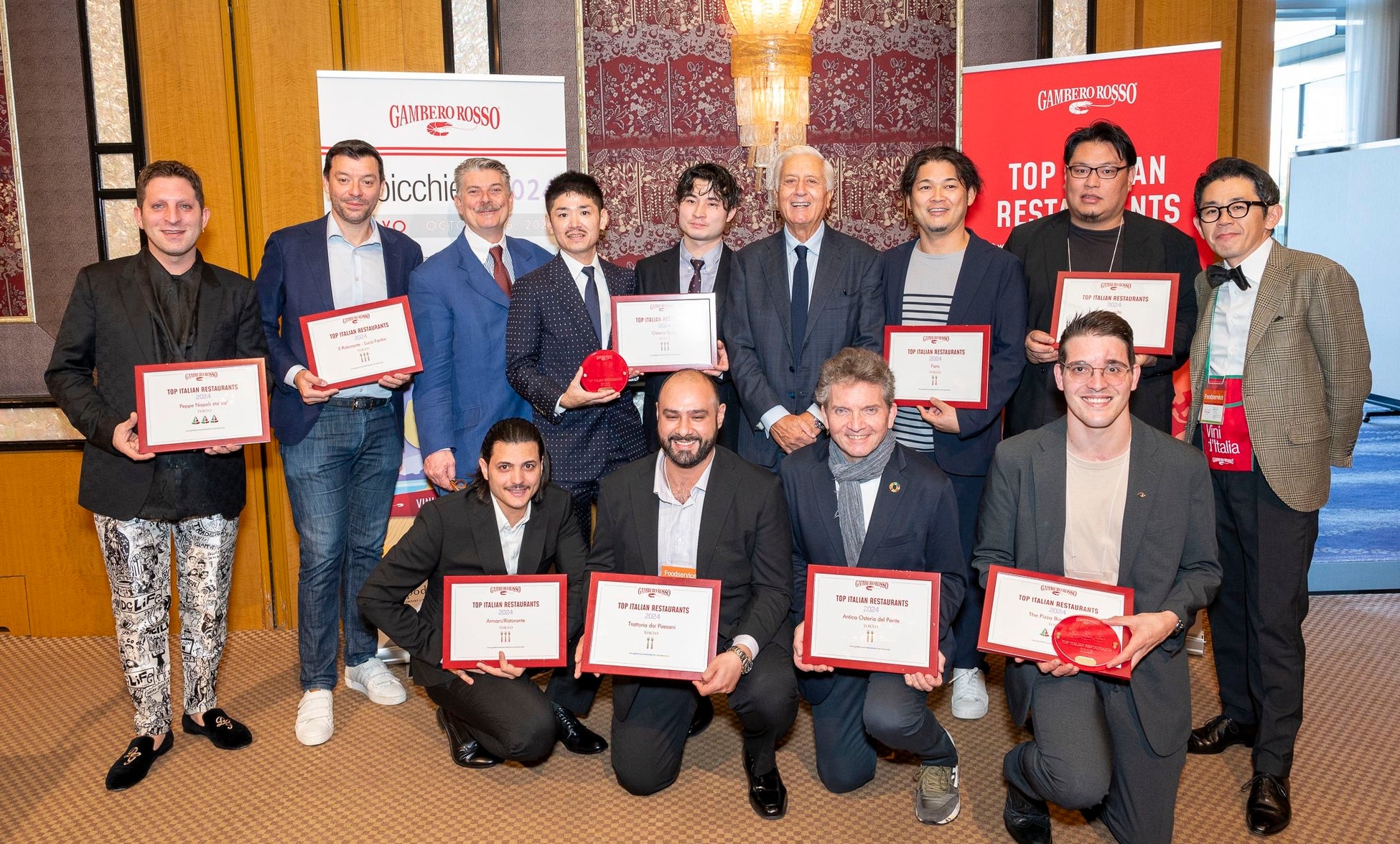 セレモニーでは、第6版となる世界のイタリアレストランの格付けデジタルガイド、『世界のトップ・イタリアンレストラン』東京版の最新2024年度版で選ばれた10軒のレストランの発表及び表彰も行いました。このガイドでもガンベロロッソの伝統的な1つから3つのシンボルとして、ファインダイニングにはフォークを、伝統的なトラットリアには海老のマークを、ピッツェリアにはピッツァのスライス、ワインバーにはワインボトルが使われています*。
