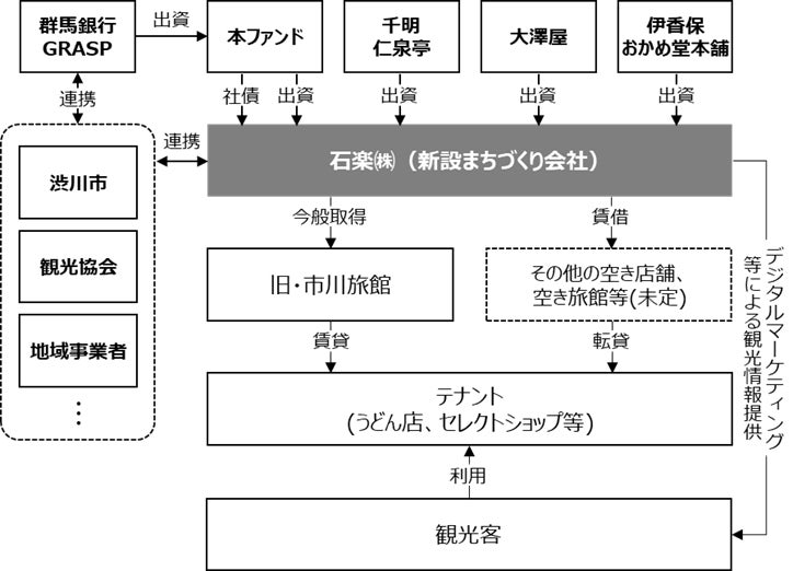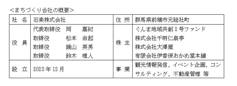 ぐんま地域共創パートナーズ株式会社(代表取締役 鏡山 英男、以下「GRASP」)は、ぐんま地域共創2号ファンド(以下「本ファンド」)を通じて、地域事業者である株式会社千明仁泉亭(代表取締役 千明 孝夫)、株式会社大澤屋(代表取締役 大河原 秀之)、有限会社伊香保おかめ堂本舗(代表取締役 松本 由起)と共同して、まちづくり会社・株式会社(代表取締役 岡 嘉紀、以下「石楽」)を設立しました。