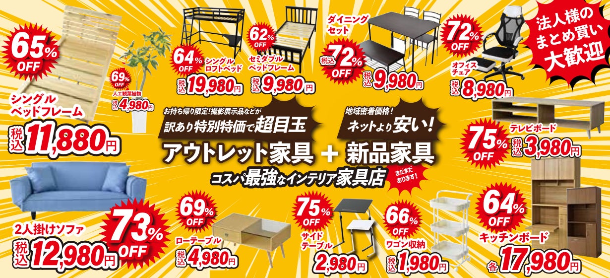 リビングにぴったりの3人掛けソファ、おしゃれなテレビボード、ダイニングテーブル&チェアセットなどが、最大80%OFFです!