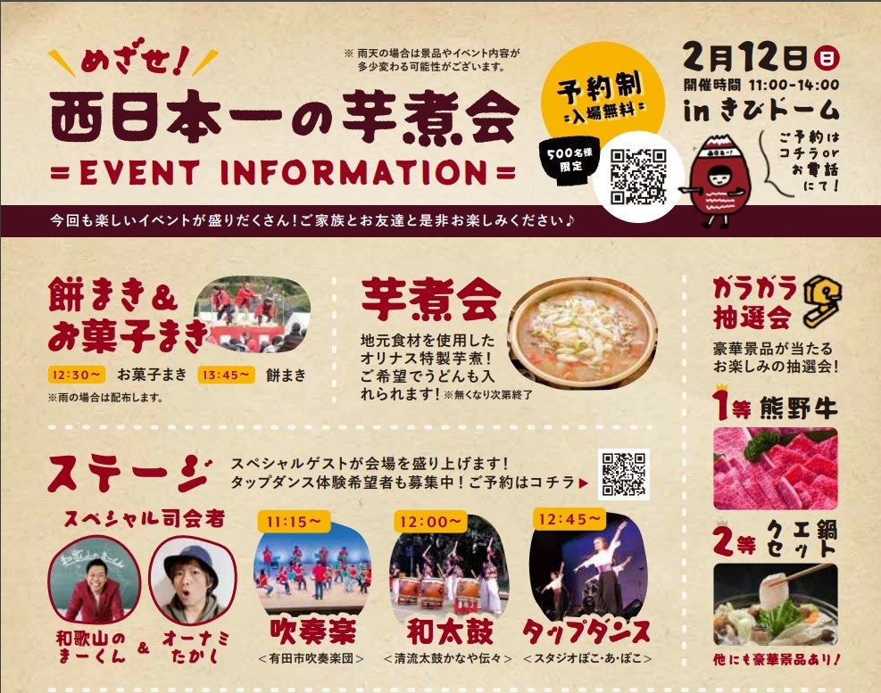 和歌山県きびドームにて 2/12(日)『めざせ!西日本一の芋煮会』を開催いたします