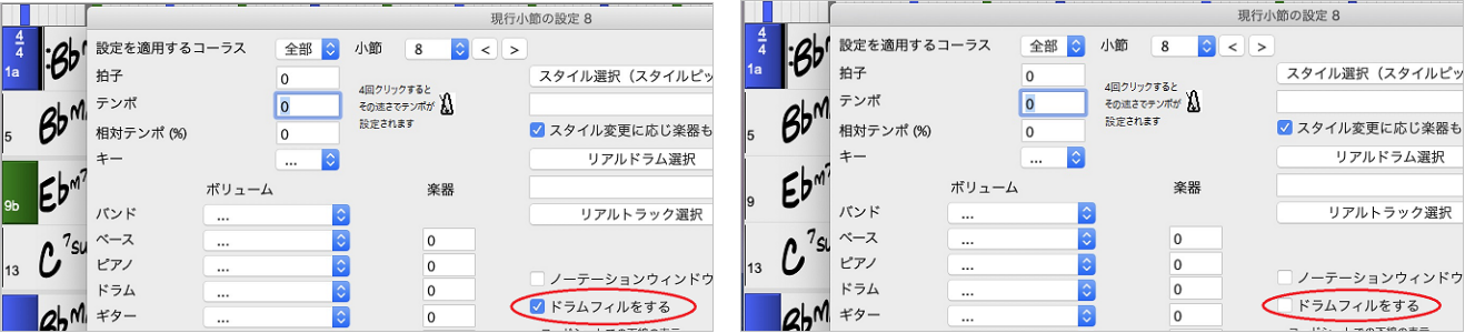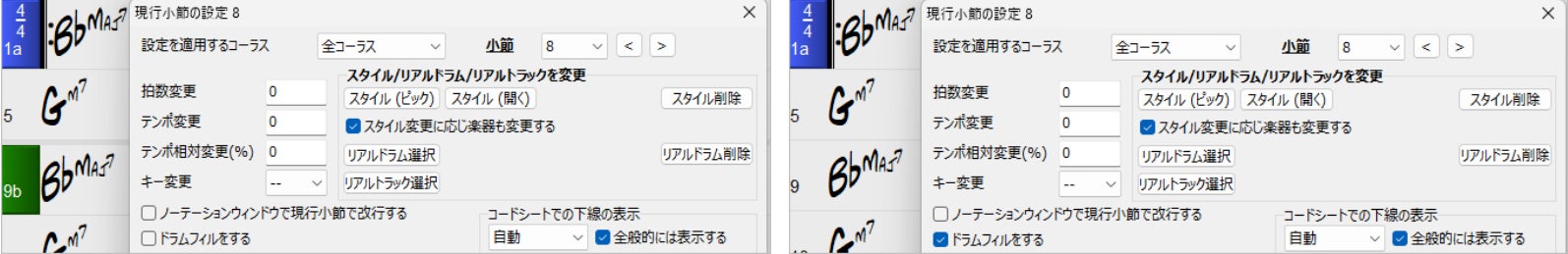 ドラムフィルはパートマーカーが付いている小節の直前で行われるものですが、パートマーカーが付いていない小節の直前でドラムフィルをしたり、パートマーカーがあってもドラムフィルなしにしたりすることができるようになりました。