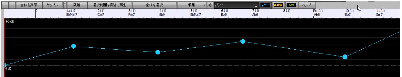 前バージョンで加わった、各トラックにおけるボリュームオートメーション機能をバンド全体に対して実行できるようになりました。(注釈:ボリュームオートメーションは、オーディオ編集ウィンドウでオーディオデータに結節点を加えることでフェードやクレッシェンドしながらボリュームをコントロールすることができる機能です。)