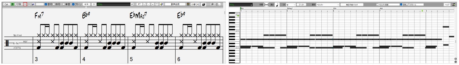 前バージョンで加わった、リアルトラックのMIDIデータ再生機能がリアルドラムトラックにも適用されるようになりました。ドラム譜として生成されたMIDIデータをリアルドラムトラックの開発時に作成された Hi-Q 音色を使って再生することができ、ノーテーションウィンドウやピアノロールウィンドウでMIDIデータを編集することによってリアルドラムトラックの演奏をカスタマイズすることができます。