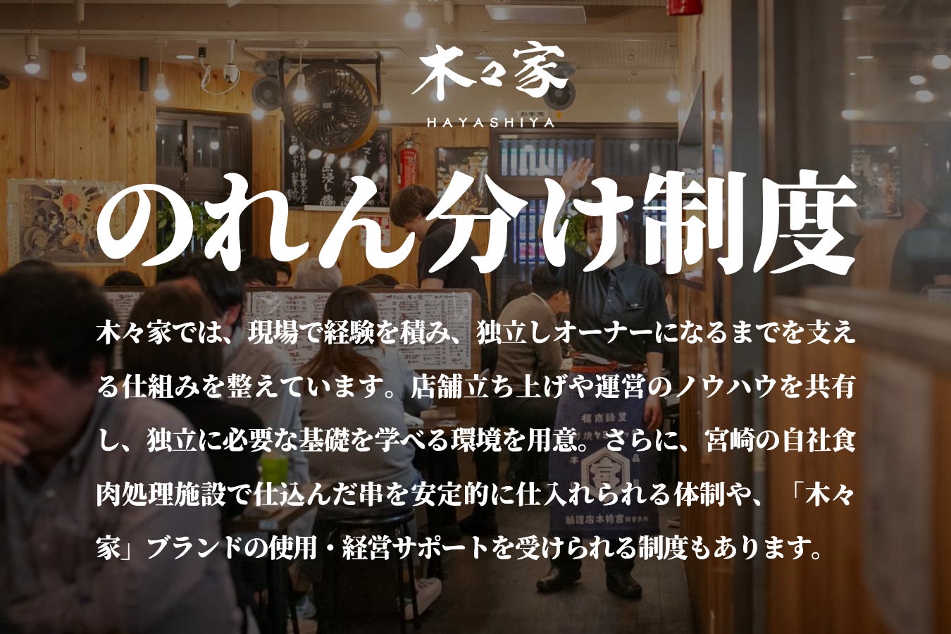木々家では、現場で経験を積み、独立しオーナーになるまでを支える仕組みを整えています。店舗立ち上げや運営のノウハウを共有し、独立に必要な基礎を学べる環境を用意。さらに、宮崎の自社食肉処理施設で仕込んだ串を安定的に仕入れられる体制や、「木々家」ブランドの使用・経営サポートを受けられる制度もあります。