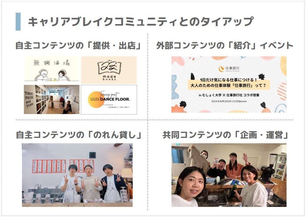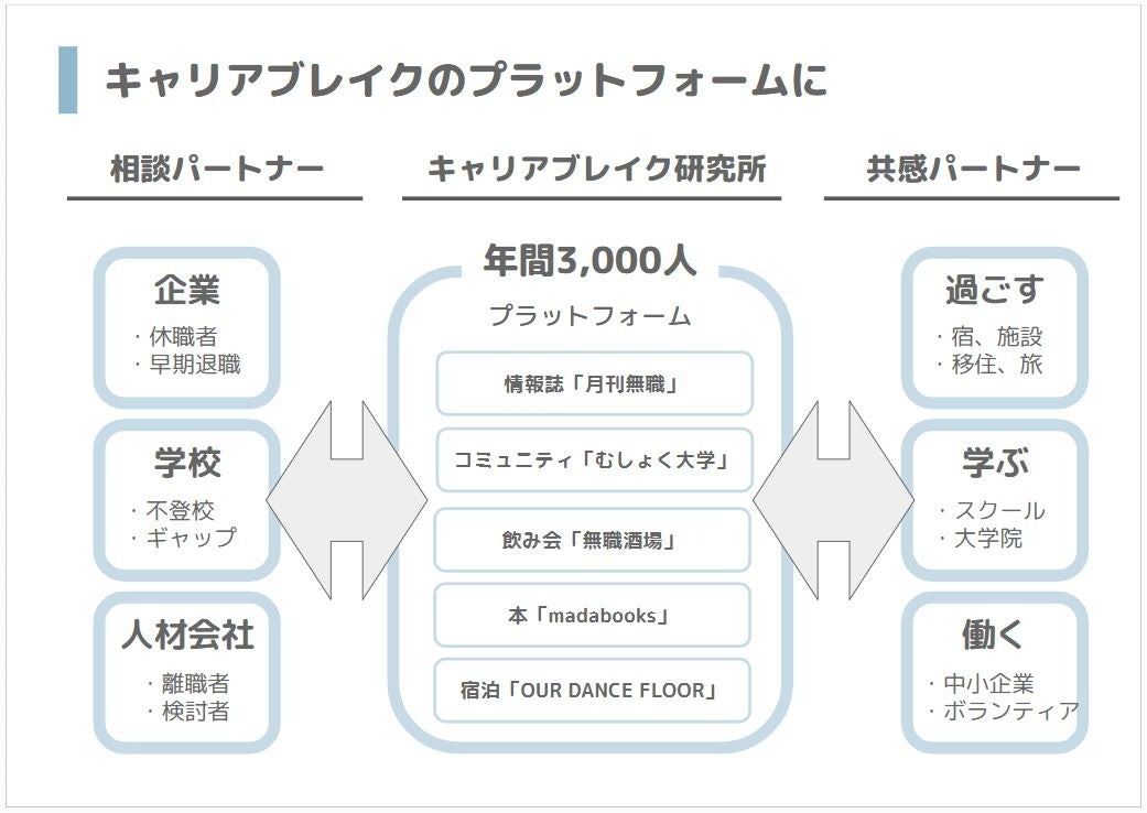 キャリアブレイクで悩む企業や学校といった「相談パートナー」、キャリアブレイクを一緒に文化にしたい宿やスクールといった「共感パートナー」と共に、私たちはキャリアブレイクを文化にするプラットフォームを目指しています。