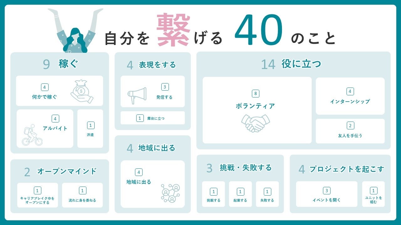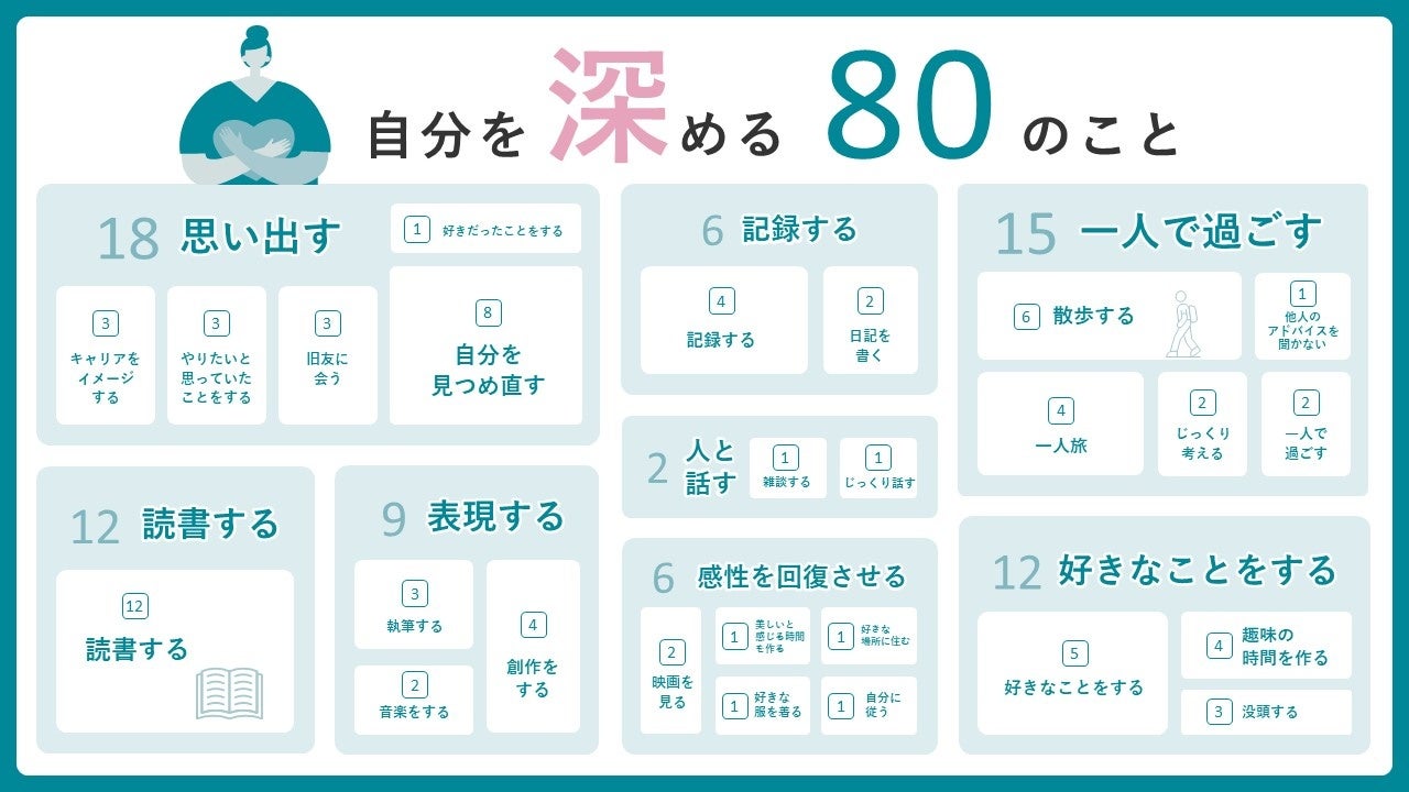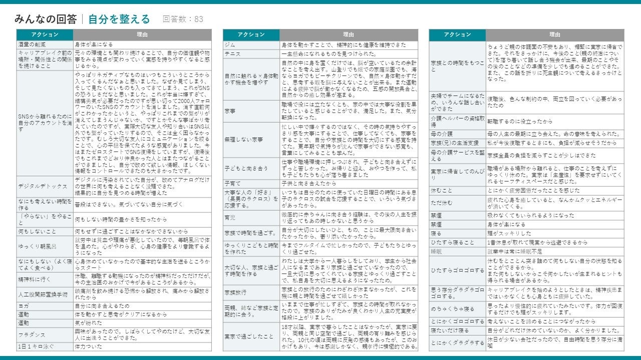 その理由と行ったことをグルーピングし整理した結果、「自分を整える」「自分を深める」「自分を広げる」「自分を繋げる」の4つに分類することができました。