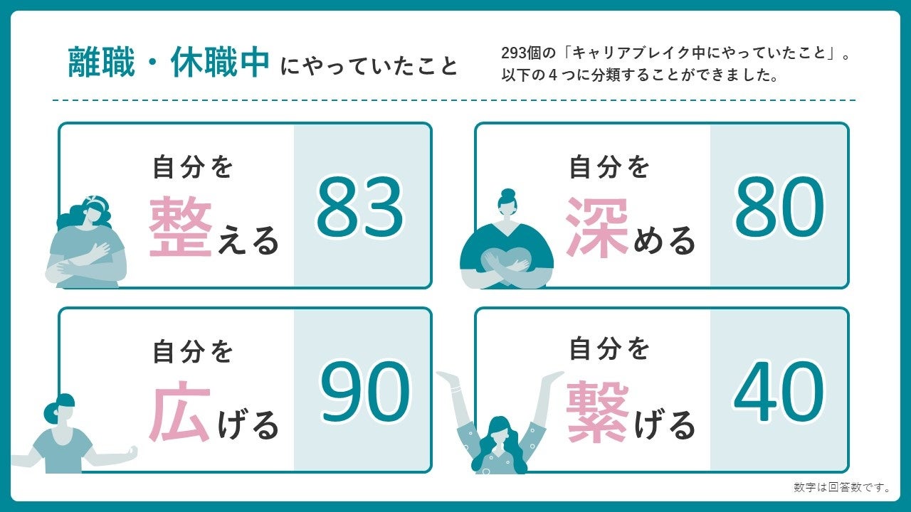 アンケートでは「キャリアブレイク中にやっていたこと(よかったこと)」を3つ上げてもらい、それぞれの理由を合わせて回答してもらいました。