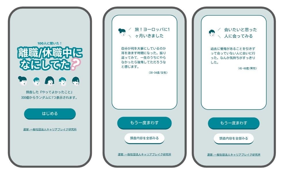 このアプリでは、調査した一人ひとりの「やってよかったこと」「その理由」「属性(性別・年齢)」がランダムで1つ表示されます。キャリアブレイク中は、どう過ごすか、なにを考えるか、真面目に向き合う時間も多くなります。一方で、運、縁、偶然性、遊び心、予期せぬ出会い、が人生を広げてくれる時もあります。そんなバランスをつくるために、あえてランダム表示のアプリを開発いたしました。