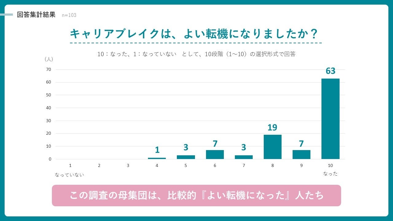 今回の調査で得られた103人からは、「キャリアブレイクは、よい転機になったか?」1(なっていない)から10(なった)の数値で答える質問に対し、63人が「10(よい転機になった)」、7人が「9」、19人が「8」という回答が得られました。