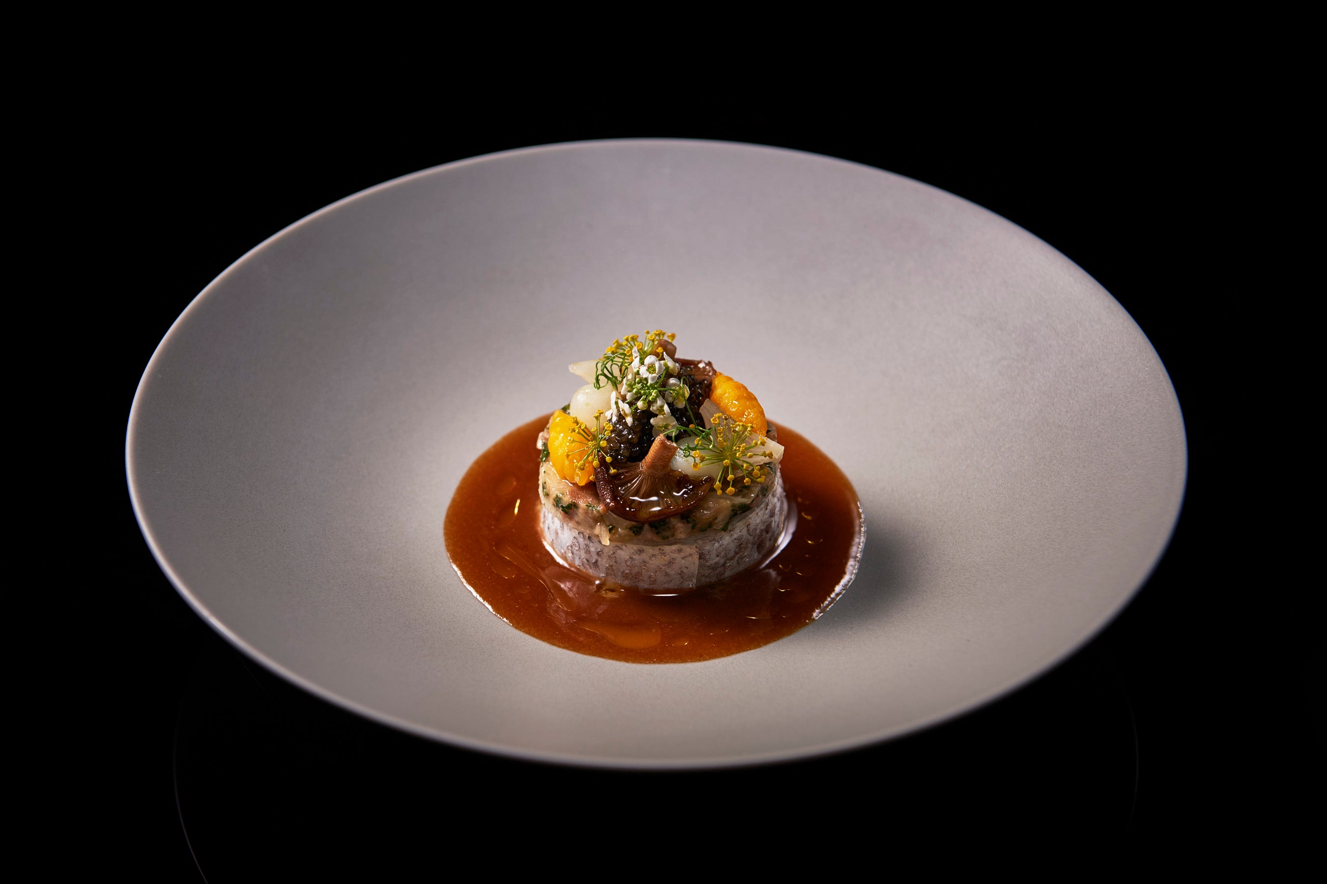細部までこだわり抜いてつくられた「オーラ」のインテリア。その緻密な「こだわり」を味わっていただく一品です。最高級のフレッシュトリュフを贅沢に使って抽出されたトリュフソースを、半熟卵の黄身の中に閉じ込めております。小さな空間に詰まった“豊かさ”をご賞味ください。