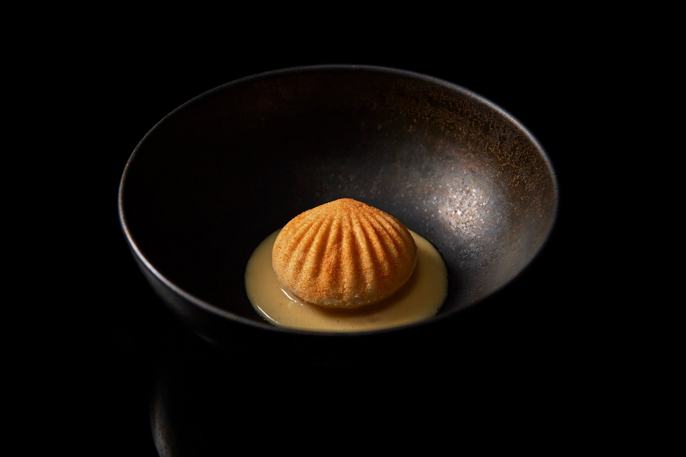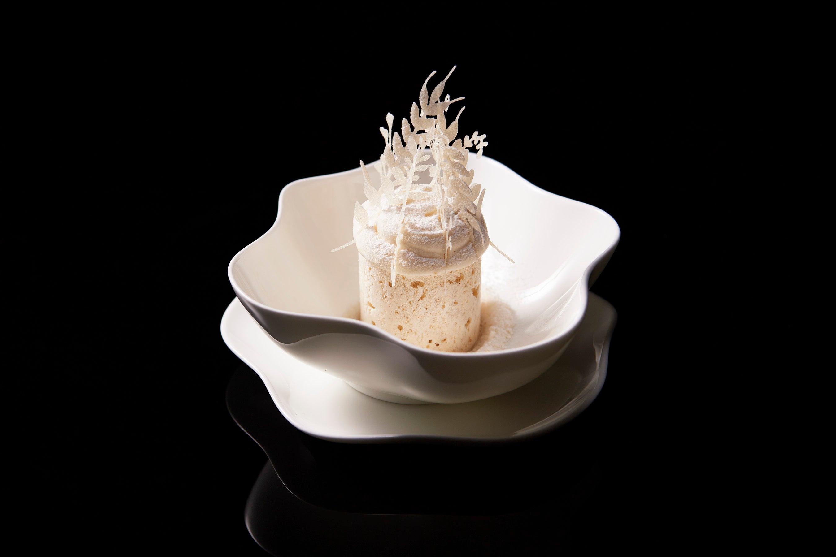 4種の地産の貝が奏でる「豊かなハーモニー」で表現しました。テーマは、伝統と進化。フランスの伝統的な貝のケーキ “シャルトリューズ” を現代的にアレンジして包み込んでいます。