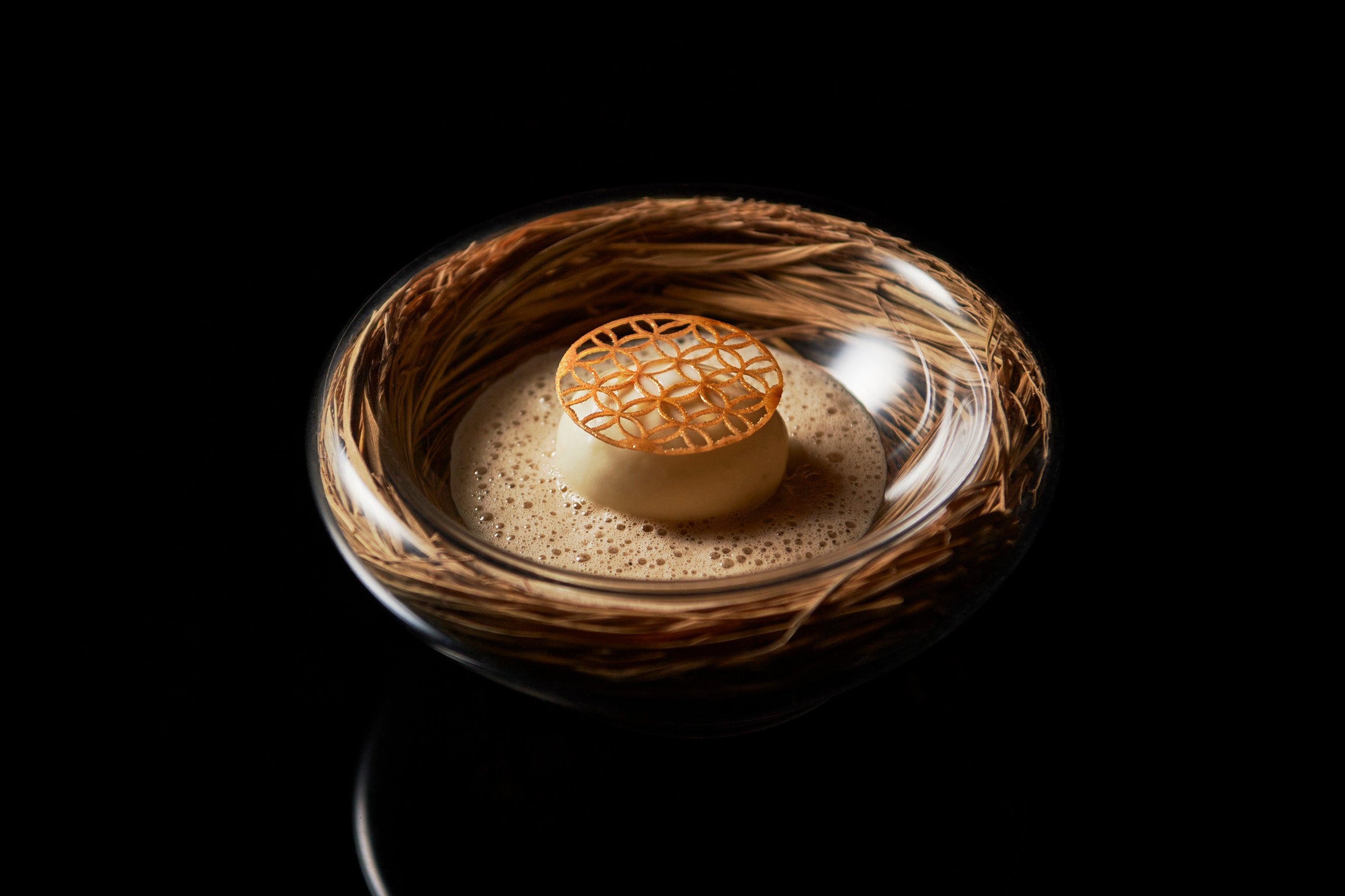 コンパクトなアミューズに上品な味わいを表現した一品。「オーラ」のように、芳醇な燻製の香りを纏わせます。添えてあるのは、幾層にも重ねられた奥行きのある味わい。その「出会い」を、インパクトフルに、そして、決して表面的でない奥深さとともに、味わっていただきます。