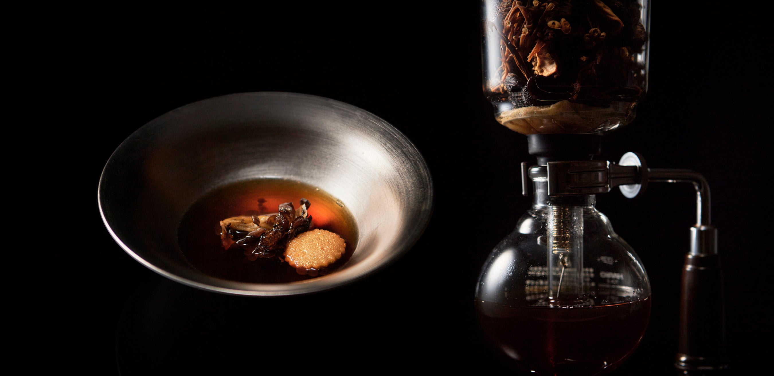 味わっていただくのは、e-POWERの「なめらかさ」と「力強さ」。じっくり時間をかけて乾燥させた鰹節、ならぬ、茸節を、サイフォンで抽出したスープです。鼻の奥にふわっと広がり抜けていく、茸と燻製のなめらかな香り。素材の味が濃縮された力強い味わいに仕上がっています。