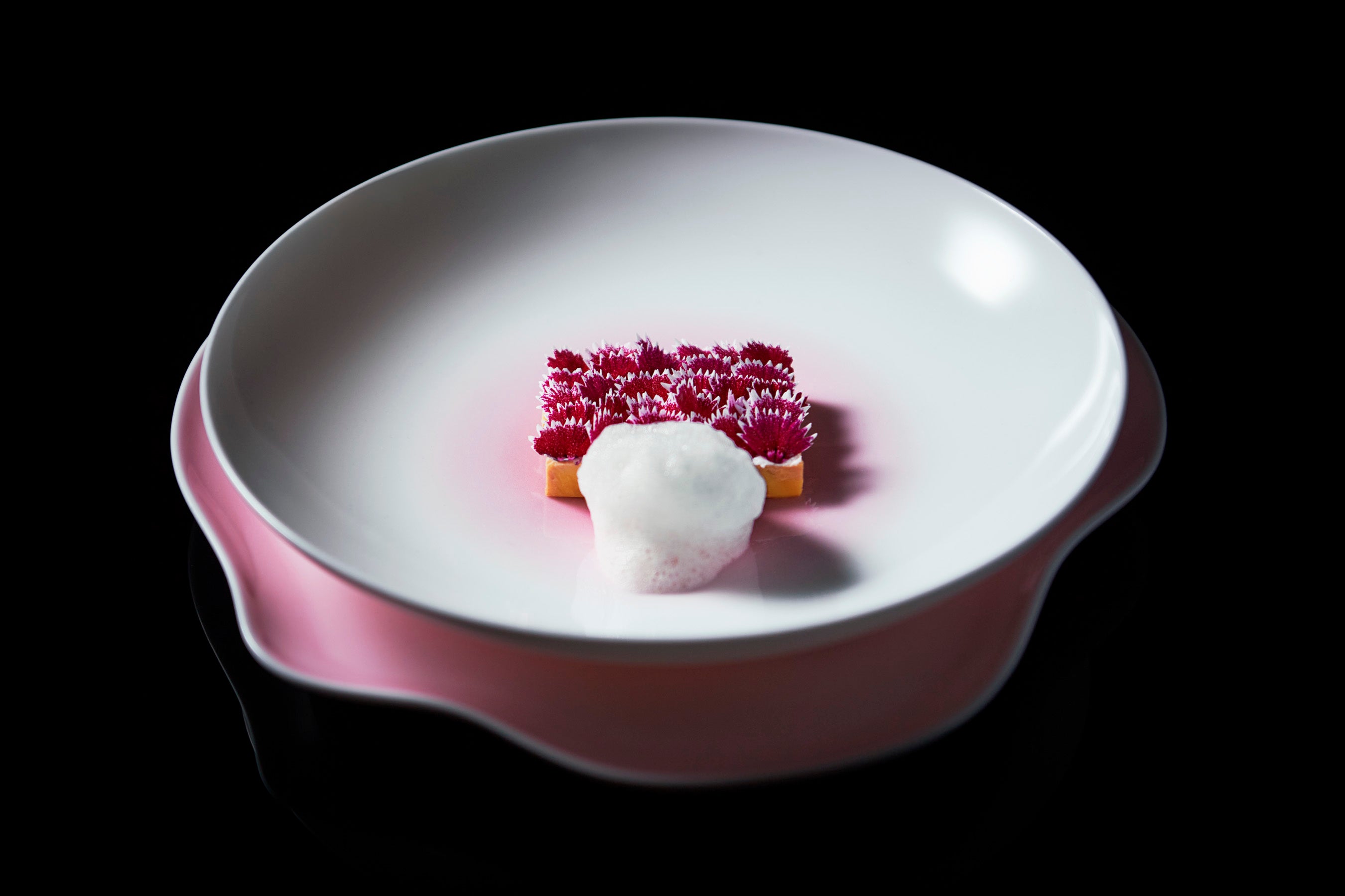 「オーラ」のエクステリアを赤いエディブルフラワーで表現。その「気品あふれる佇まい」を、まずは目で、次に、フォアグラのテリーヌと共に舌で味わっていただきます。お口直しでは、フランボワーズとビーツのシャーベットを。周囲のグリーンが赤を引き立て、鮮烈なエクステリアの印象を残します。