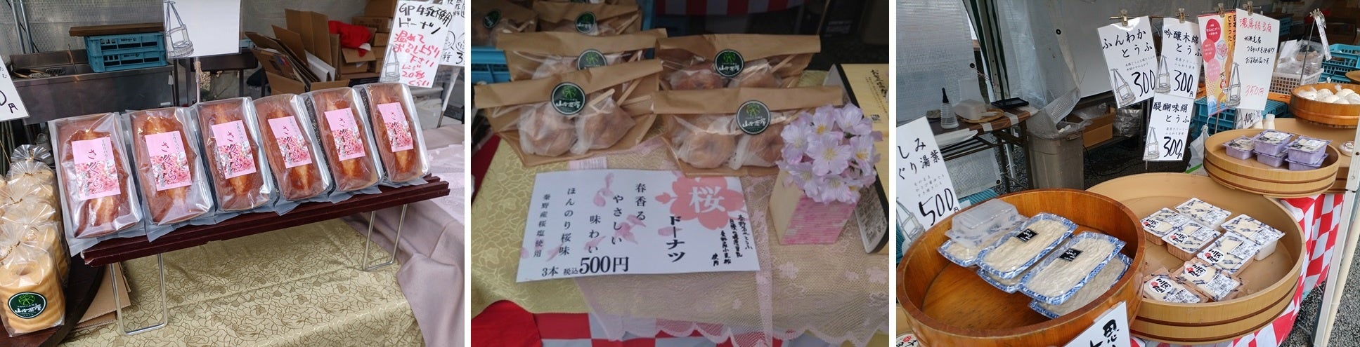 境内では秦野名水仕込みのおいしいお豆腐を手作りする「杜の豆腐工房三河屋」の出張販売も。桜ジェラート・桜パウンドケーキ・桜ドーナツなどこの時期にしかないお土産をご用意しております。