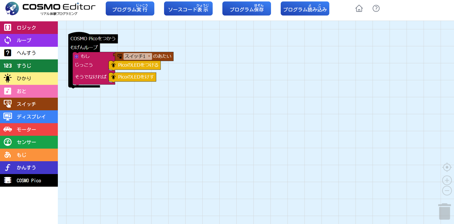 「COSMO Pico」を合わせてご利用頂く事で「COSMO Editor」を最大限活用できるようになっており、よりプログラミングやモノの仕組みを学習しやすくなっています。