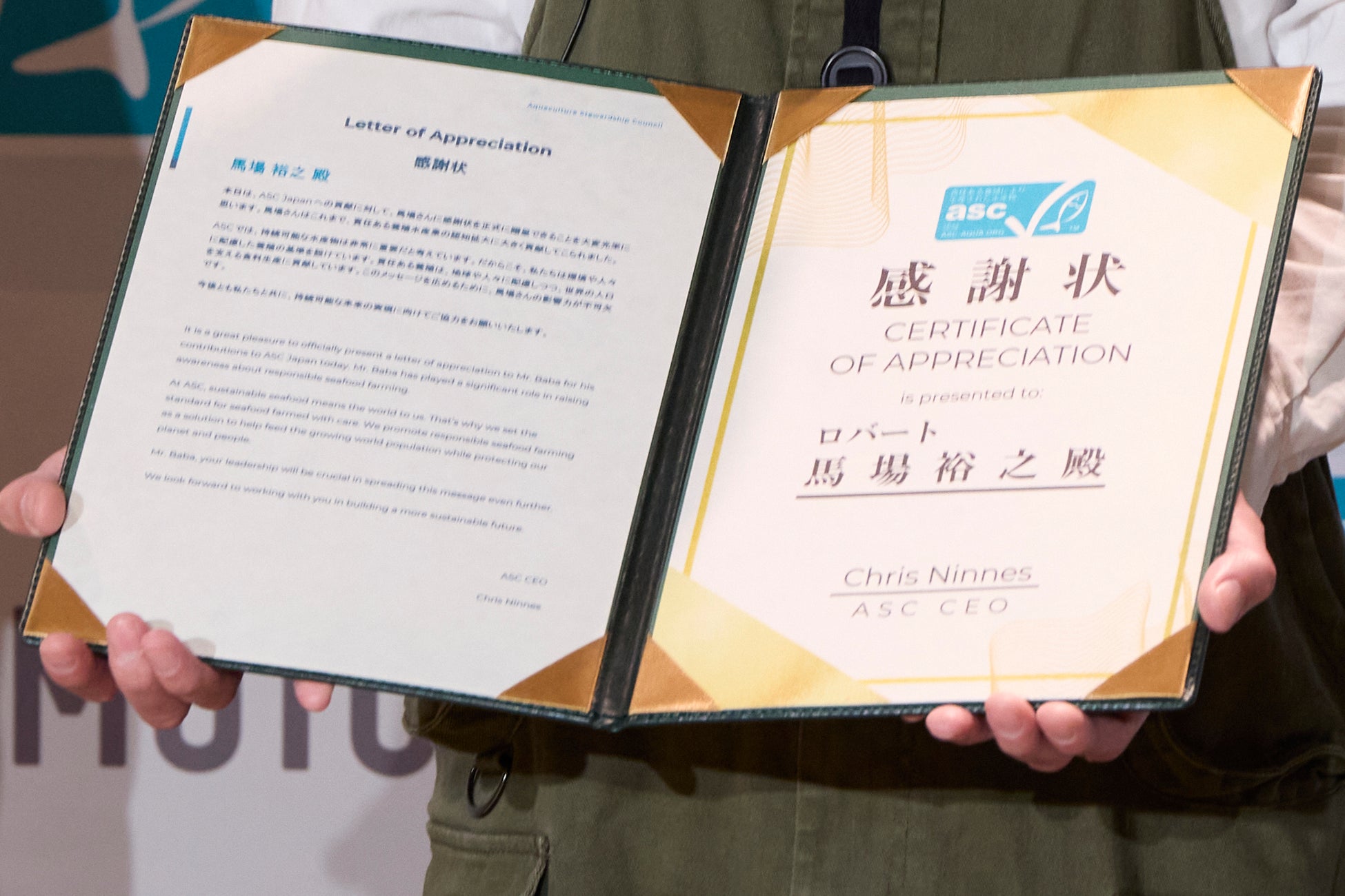 環境に配慮した養殖の普及に努める非営利団体ASC(水産養殖管理協議会)ジャパンは、11年目を迎えるキャンペーン「サステナブル・シーフード・ウィーク 2024」を10月1日(火)から10月31日(木)まで開催しています。そのメインイベントとして、10月8日(火)に、ASC CEOクリス・ニネスからロバート・馬場裕之さんへ、過去二年間にわたり「サステナブル・シーフード・ウィーク」を通じて、ASC認証ラベルの認知拡大に大きく貢献したことに対し、感謝状が贈呈されました。