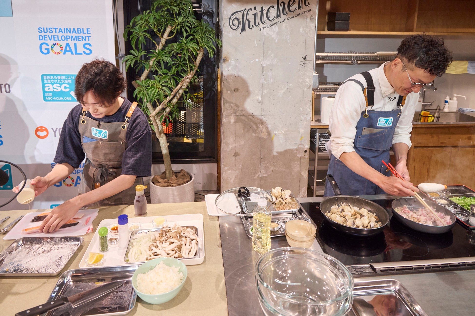 また、当日はロバート・馬場さんと料理研究家・リュウジさんが、ASC認証のサーモン・エビ・ハマグリ・パンガシウスを使って料理対決を行いました。お笑いコンビ相席スタート・山﨑ケイさんも登場し、その料理に舌鼓を打ちました。この料理対決を通じて、一般参加者は美味しく楽しく、責任ある水産養殖の重要性やASC認証ラベルが環境および社会にどのように貢献しているかを学ぶ機会となりました。