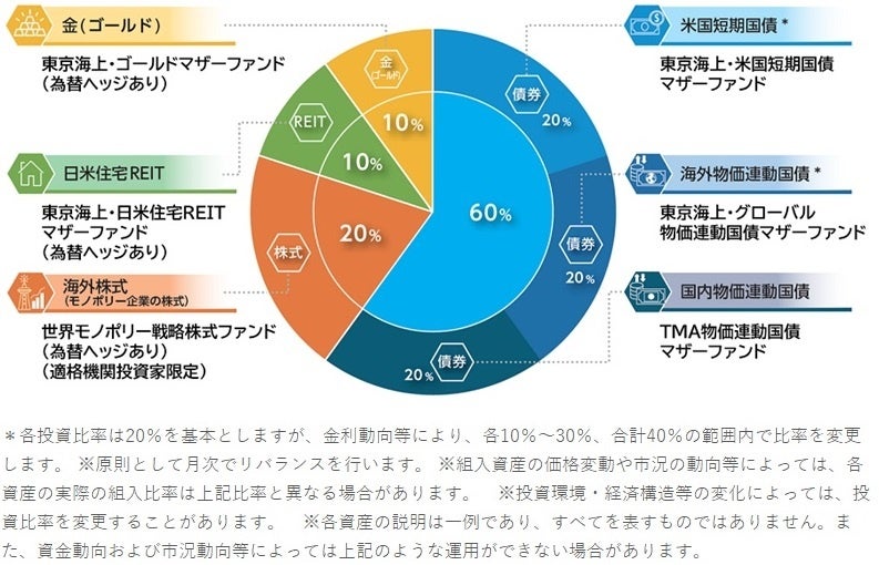 投資信託証券への投資を通じて、米国短期国債、海外物価連動国債、国内物価連動国債、海外株式、日本および米国の住宅REIT、金に分散投資を行います。各資産への投資比率は以下の通りです。