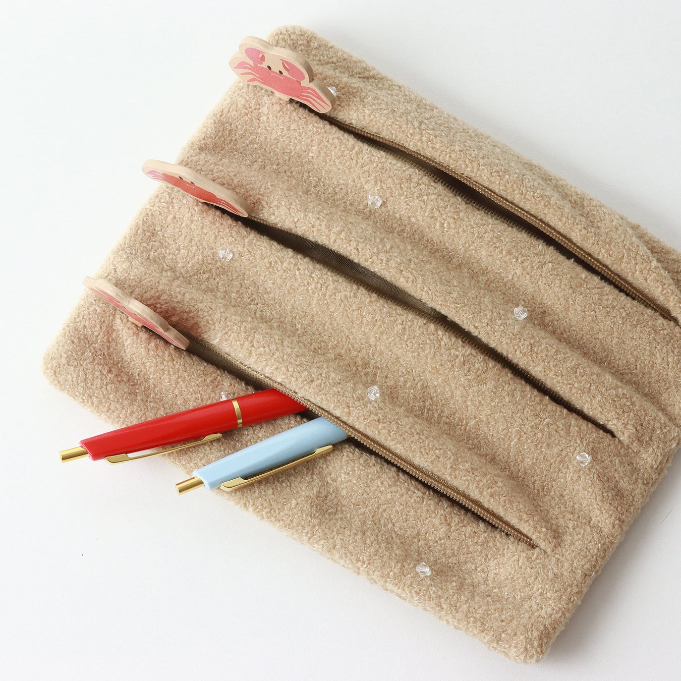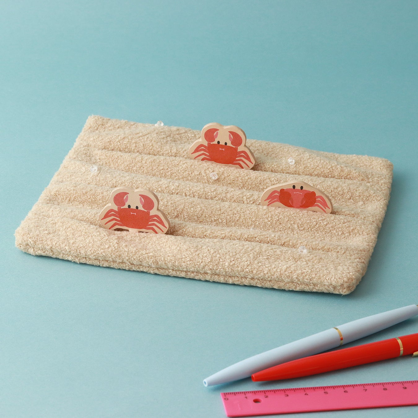 砂浜をカニが移動する風景がフラットポーチになりました。ポーチを開閉するたびに、いつでもカニを横歩きさせることができます。