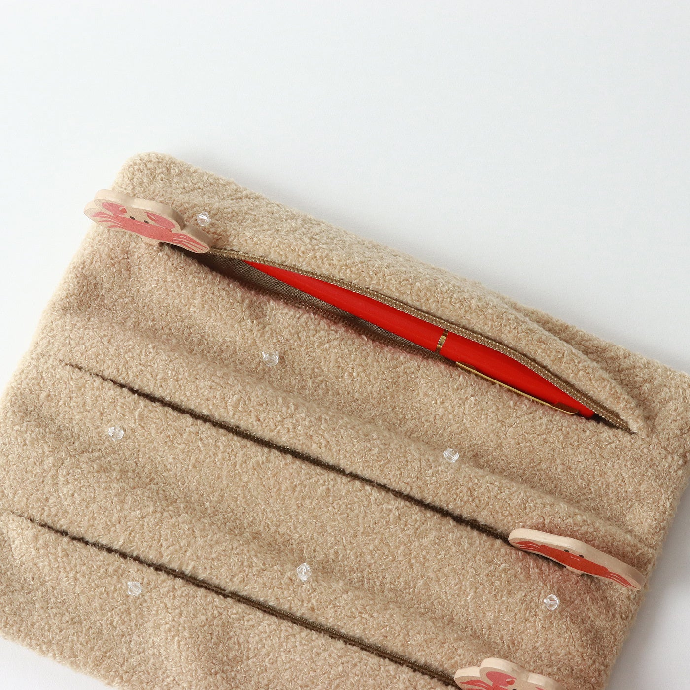 ポーチ本体はキラキラと輝く砂浜をイメージし、ベージュカラーの生地にクリアビーズをあしらいました。