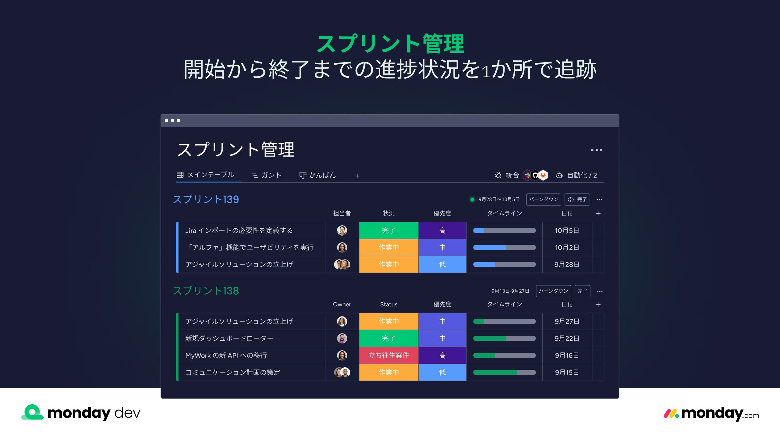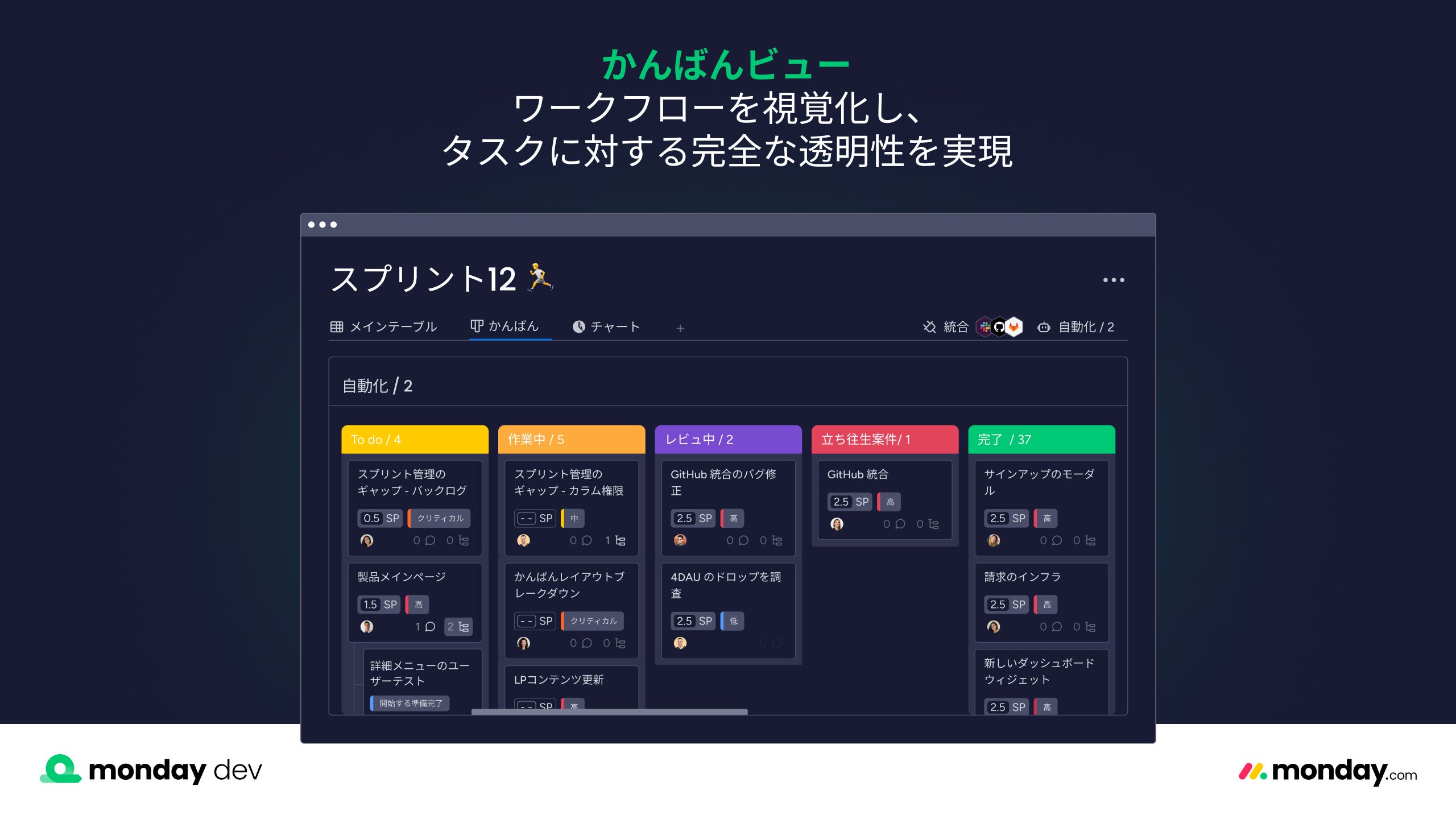 monday dev は製品開発チームに向けて、企画・開発・共同作業を一元的に行えるアジャイルプラットフォームをご提供します。