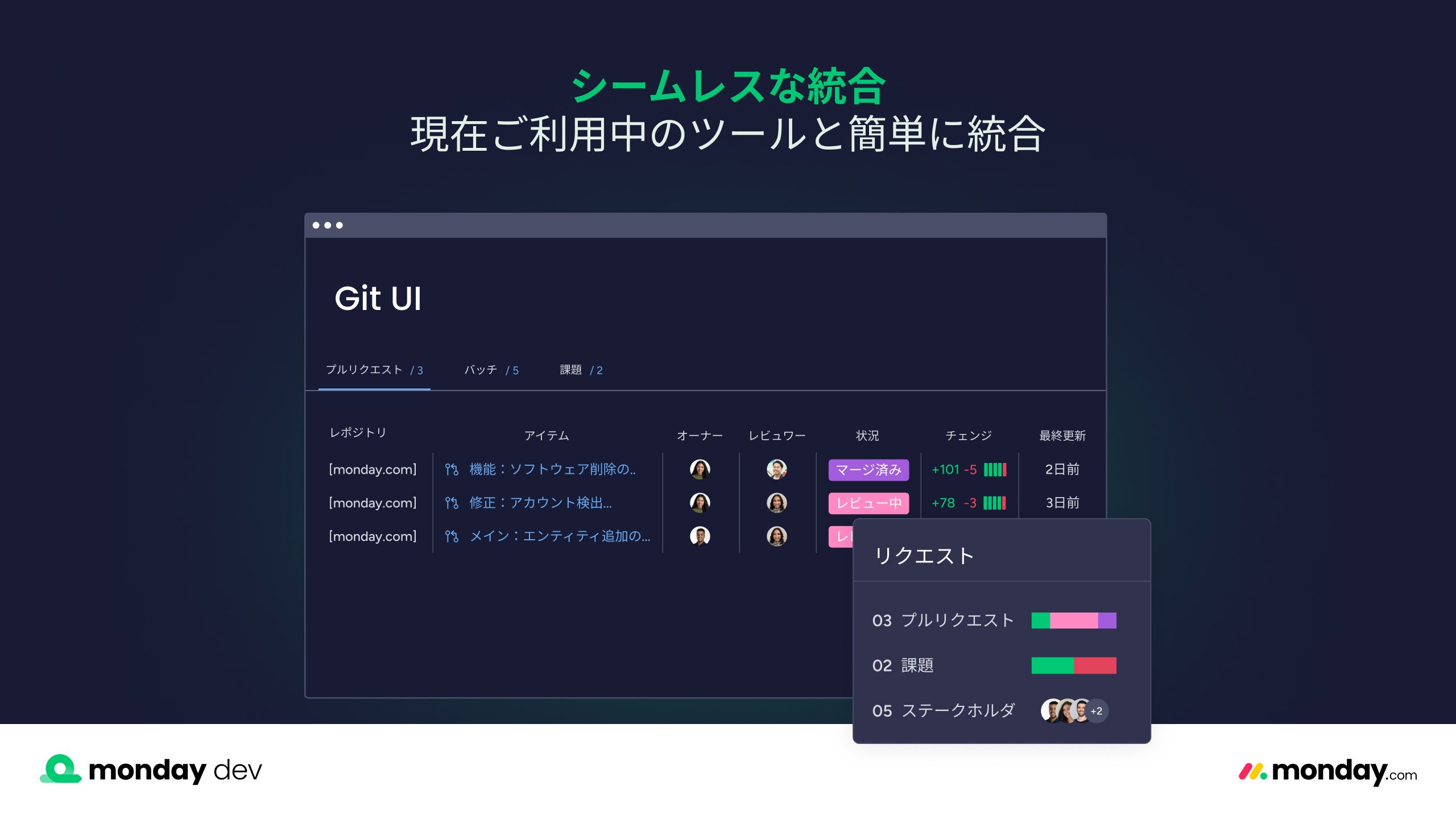 シームレスな統合:GitHub、GitLab、BitBucket、Slack、Microsoft Teams、Zendesk、Gmail など、チームがすでに利用しているツールとの統合をスムーズに行うことができます。