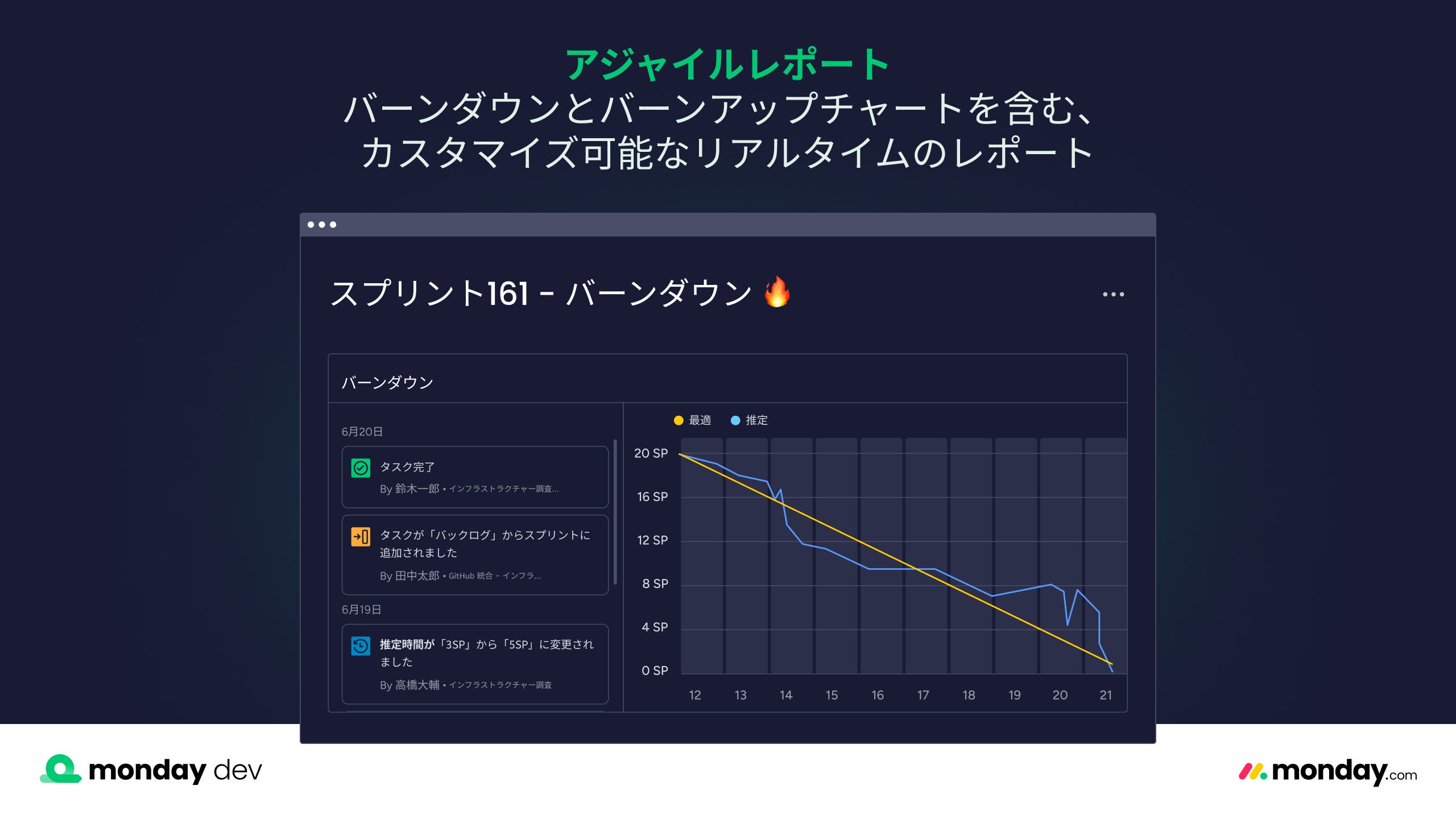 アジャイルレポート:バーンアップチャート、バーンダウンチャートなど、リアルタイムでのレポートをカスタマイズできます。