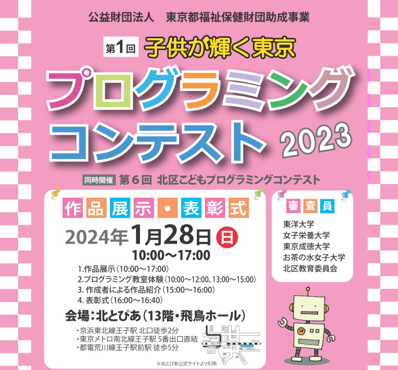 NPO法人プログラミング教育研究所は、「第1回子供が輝く東京プログラミングコンテスト作品展示・表彰式」を、2024年1月28日、北とぴあ(東京都北区王子)で開催します。