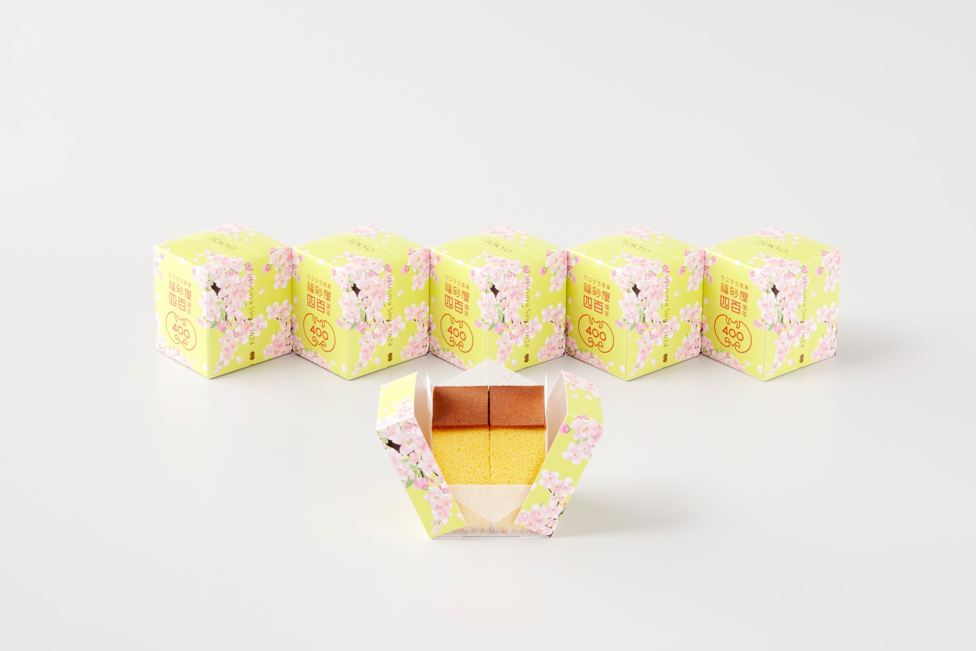 お花見のおともに。カステラの老舗「福砂屋」中目黒店限定! 桜と新緑をモチーフにした400周年記念パッケージが登場 『フクサヤ さくらキューブ』