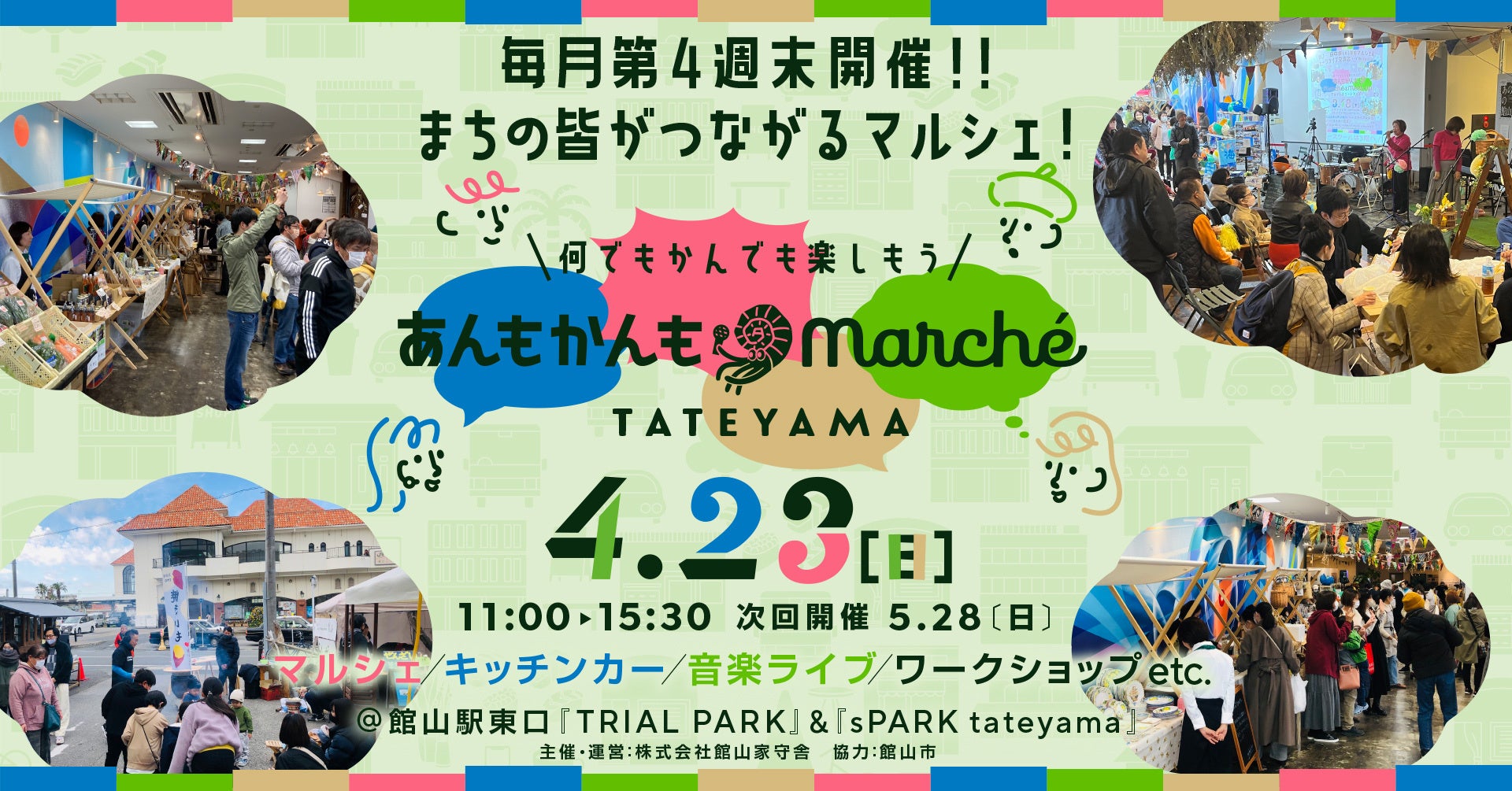 株式会社館山家守舎(たてやまやもりしゃ。本社:千葉県館山市、共同代表 本間 裕二・漆原 秀。以下、当社。)は館山市から令和4年度館山リノベーションまちづくり事業を受託し、計4回、地域グルメや音楽が楽しめる「あんもかんもMarché」を開催した。今年度、令和5年4月からは、民間の当社が主催する事業として、2023年4月23日(日)からスタートする。開催場所もこれまで同様、館山駅東口駅前に昨年秋に新しく誕生したパブリックスペース "sPARK tateyama" となる。