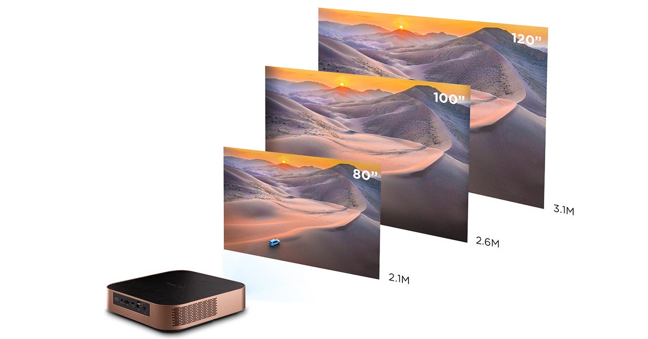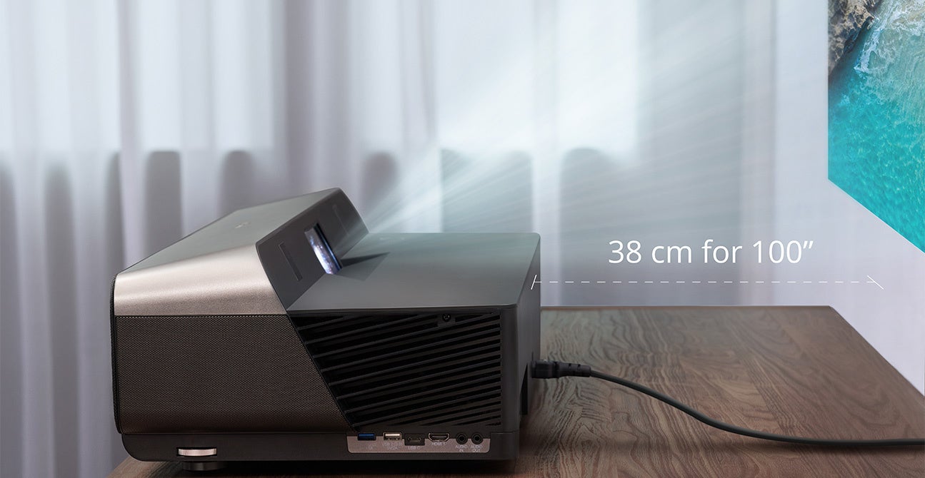 X1000-4K+は超単焦点モデルであり、わずか38cmの距離から100インチの大画像を投写でき、 最大150型の画面を65.7cmの距離だけで実現できます。小スペースでも大画面体験をお楽しみいただけます。