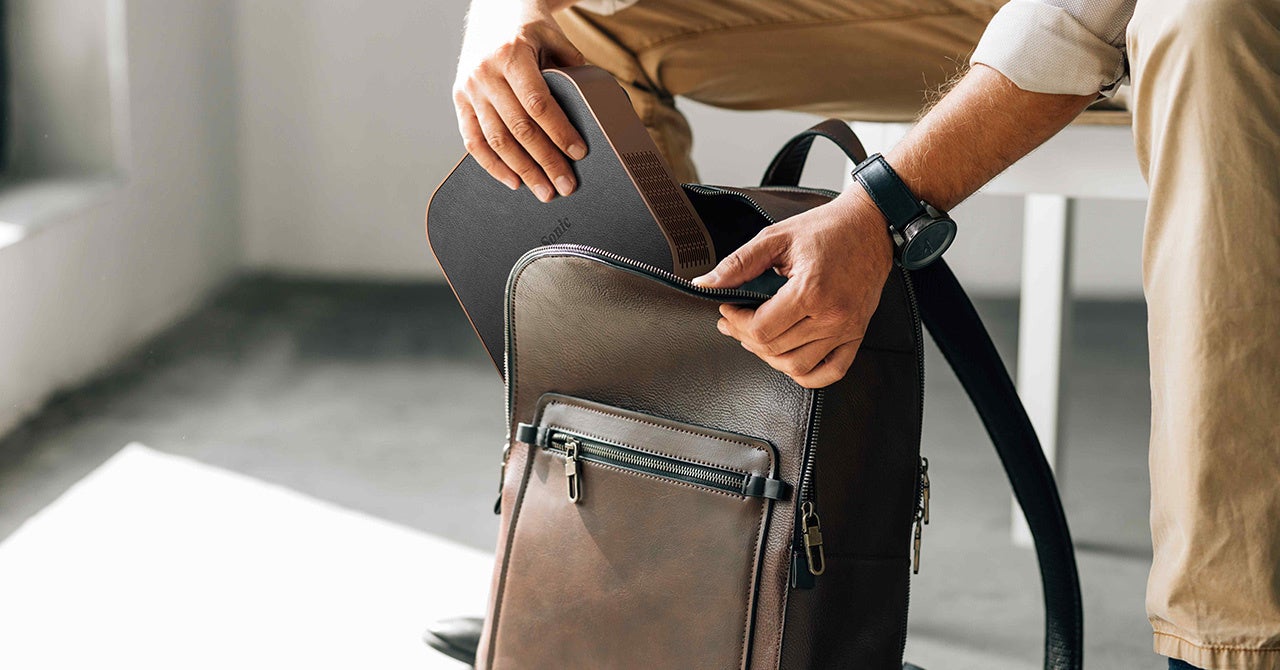 メタリックな質感とレザーを組み合わせたスタイリッシュなデザインと、バッグに収納しやすいコンパクトなサイズです。また、無段階調整可能なスタンドで、投映の角度と画面の位置を自由に調整できます。