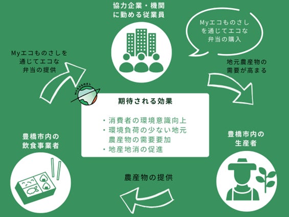実証期間中、クオンクロップが開発した商品の温室効果ガス排出量を可視化するWEBアプリ「Myエコものさし」上で、輸送に係る環境負荷の少ない地元農産物を用いた弁当を購入できるようにすることで、需要者の意識や行動の変化を検証します。